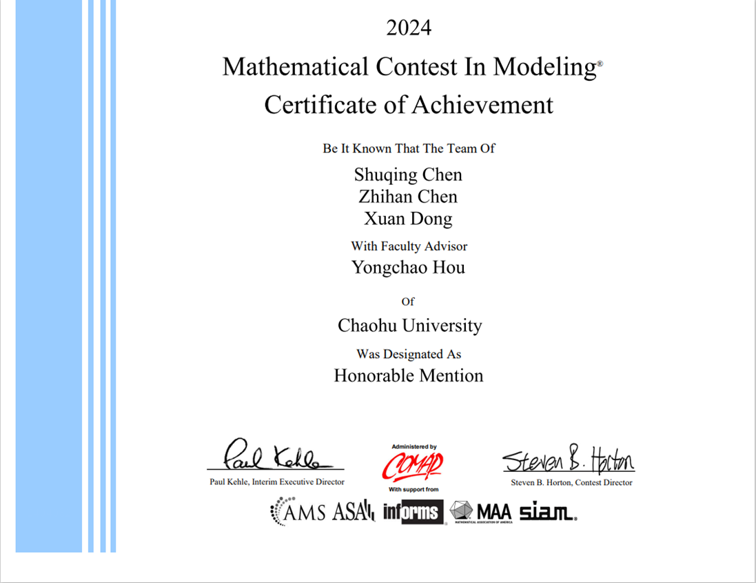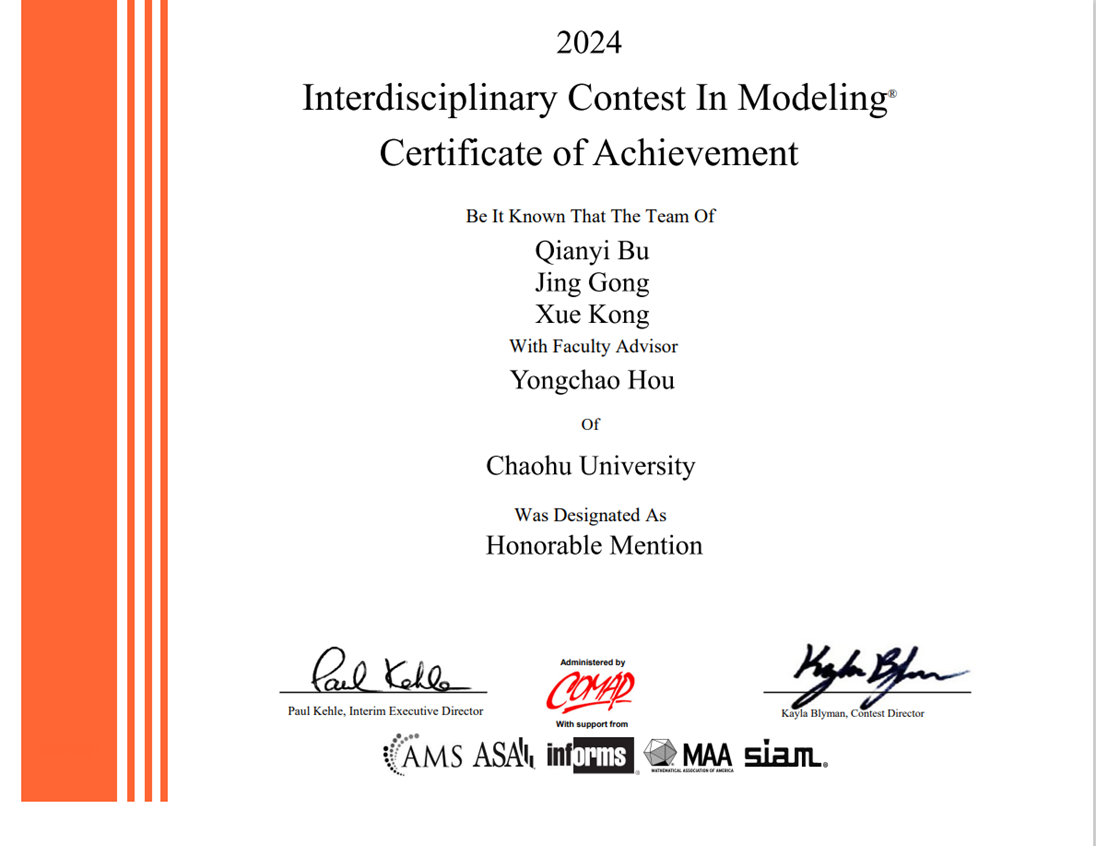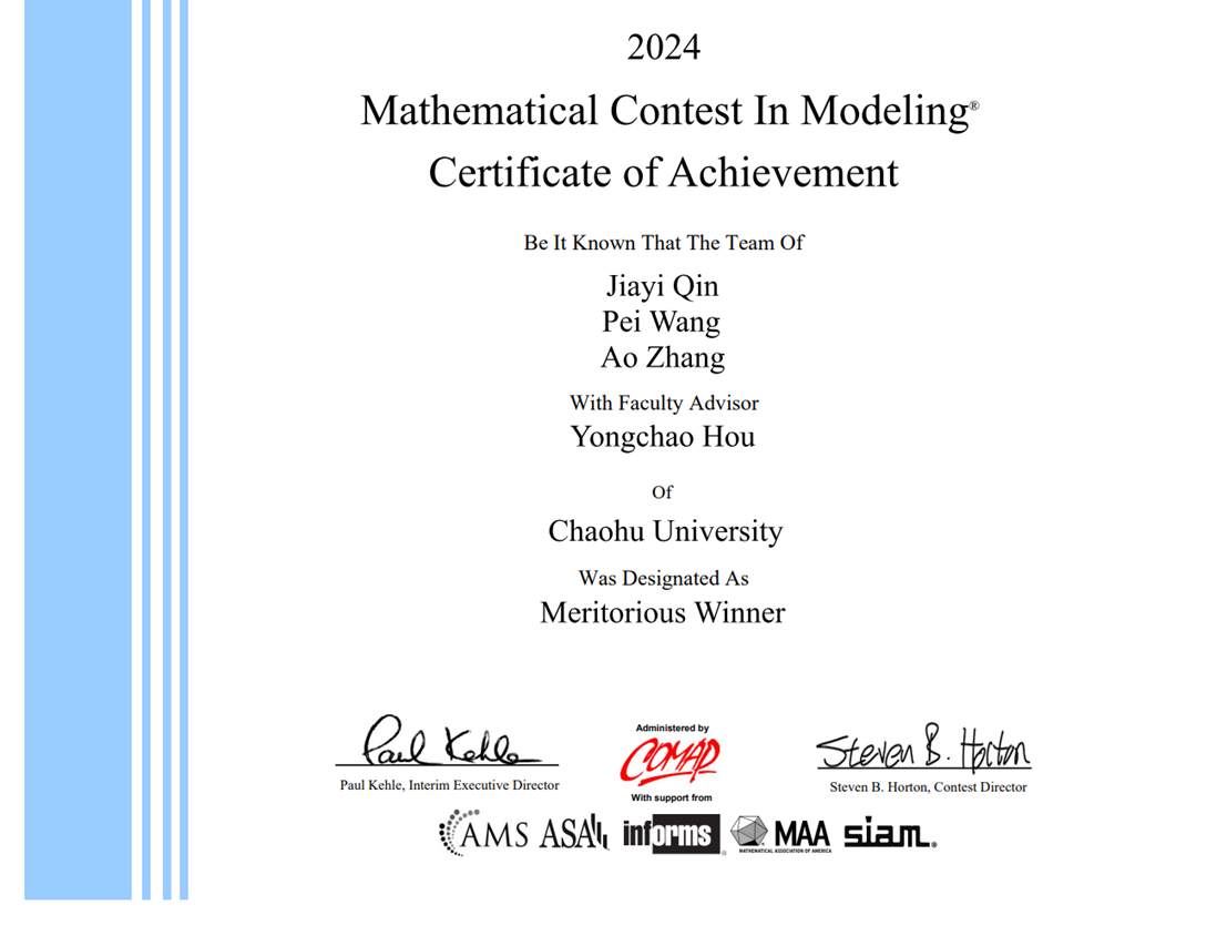 近日,2024年美国大学生数学建模竞赛(Mathematical Contest in Modeling/ Interdisciplinary Contest in Modeling, MCM/ICM)成绩正式揭晓。此次比赛Beat365唯一官方网站共遴选出5支队伍参加比赛,在全体参赛队员与指导教师的奋力拼搏下,在获奖等级和数量上均取得历史性突破。其中,首次获得国际一等奖(Meritorious Winner,获奖率为6.66%)1项(秦家怡、王佩、张傲)、首次获得国际二等奖(Honorable Mention,获奖率为23.06%)2项(陈淑晴、陈芷晗、董璇;卜前亿、孔雪、宫静),使得我们在二等奖及以上奖项获奖率达60%,远超全球31.6%的获奖率。