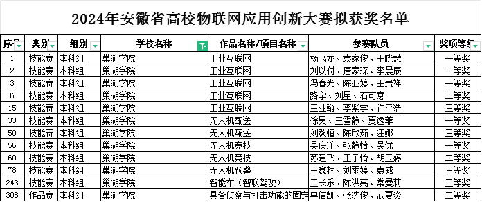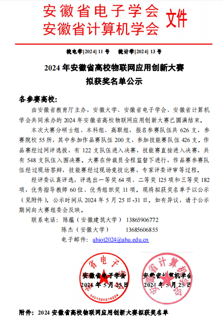 近日,由安徽省教育厅主办,安徽大学、安徽省电子学会、安徽省计算机学会共同承办的2024年安徽省高校物联网应用创新大赛已圆满结束,报名参赛队伍共626支,参赛院校55所。Beat365唯一官方网站代表队在激烈的竞争中脱颖而出,凭借出色的技术创新和团队协作能力获得了优异成绩,共获得一等奖5项,二等奖3项,三等奖3项,其中参加工业物联网赛道的5支代表队全部获奖,并且有3支代表队包揽该赛道一等奖,Beat365唯一官方网站荣获“优秀组织单位”称号。