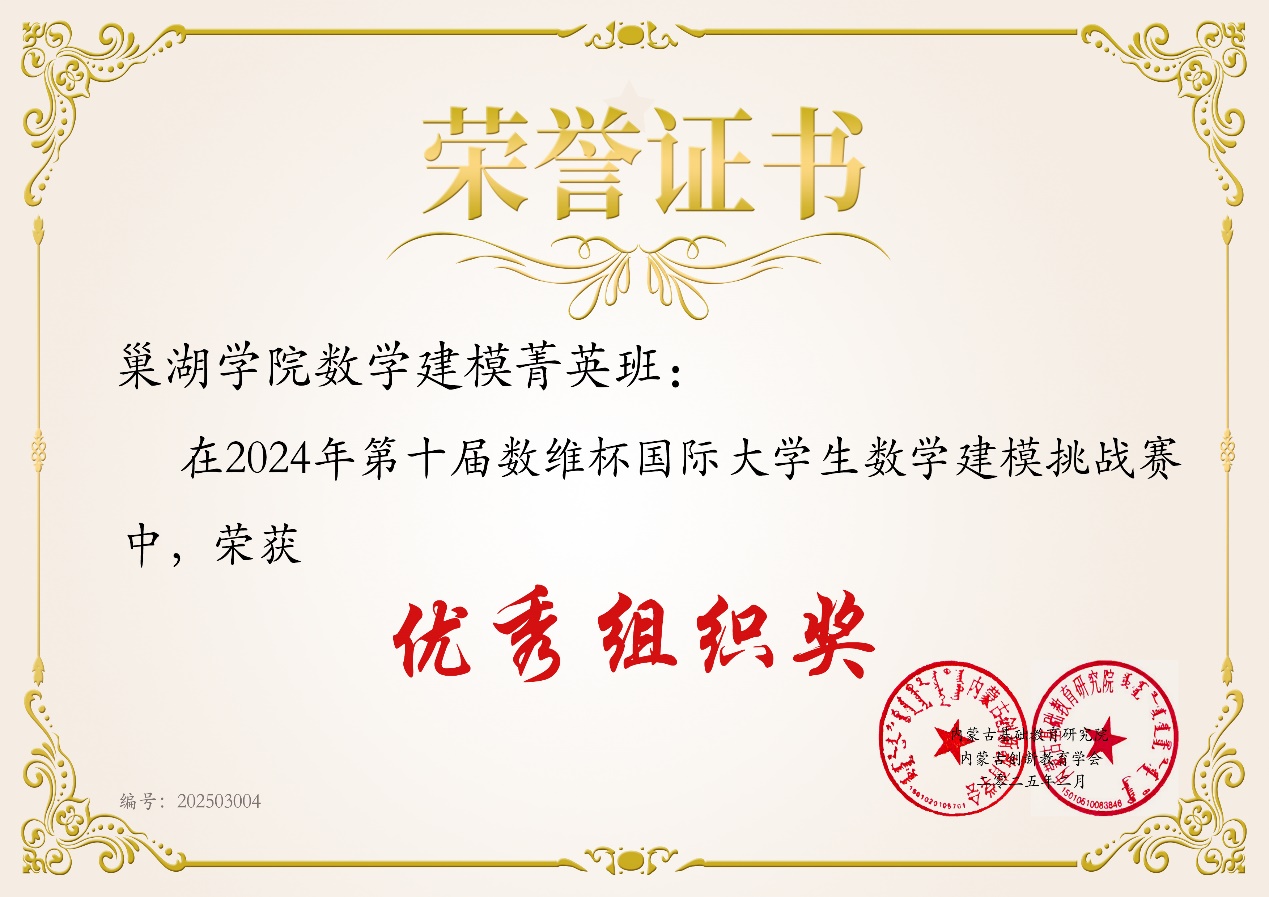 近日,2024年第十届数维杯国际大学生数学建模挑战赛成绩公布,Beat365唯一官方网站数学建模菁英班在比赛中斩获佳绩:由王坤、潘磊、芮雪梅组成的参赛队荣获一等奖,马天悦、赵雯欣、祁萍,以及程督督、夏兴汉、王静慧两支队伍分获二等奖,菁英班同时荣获“优秀组织奖”。