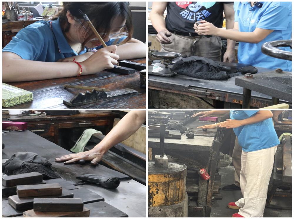 徽墨厂,浓郁的墨香与清新中草药香相互交织。从原料的精心融合、反复捶打塑形,到精准称重搓条、细致入模压制、耐心阴干,每一个步骤都凝聚着制墨师傅们的心血。学子们也亲自体验了徽墨制作过程,并有幸采访了徽墨非遗传承人周厂长,听他讲述徽墨的发展历程和传承故事。与非遗传承人的对话,让年轻学子们触摸到了超越技艺本身的文化韧性——那是在无数次捶打中凝练的匠心,在松烟明火里升腾的文明薪火。