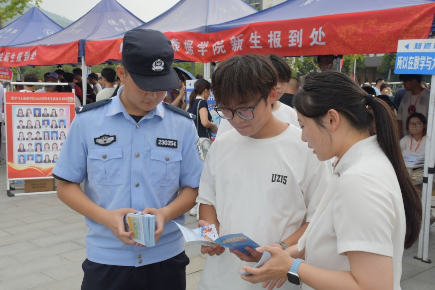 计算机与人工智能学院的报到处前人头攒动,新生们怀揣着对智能科技领域的向往,在工作人员指引下有序完成信息核验,即将开启专业探索之旅。工作人员提前备好入学资料袋,细致讲解专业学习方向,为新生勾勒大学成长蓝图。现场设置的“党员示范岗”更是成为暖心标杆,党员老师与学生志愿者坚守岗位,细致办理入学手续。警察同志为提高新生的反诈能力对他们进行耐心地讲解,全体老师、志愿者们均以饱满的热情投入迎新工作之中。
