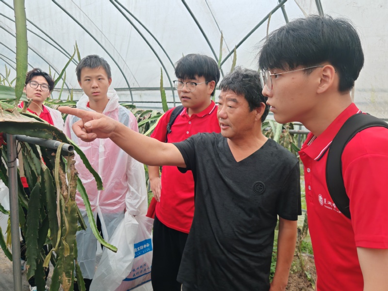 7月13日下午,乡村振兴实践团成员来到瀛洲镇百果园种植基地。果园负责人亲自为实践团成员介绍了果园的火龙果以及使用的新型散热系统。