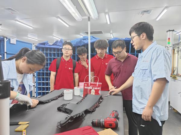 在工作人员的带领下,团队成员实地观摩了华翔汽车车门有限公司生产车间。队员们对职工进行了现场采访,受访人员表示,较之传统汽车产业和传统制造业,新能源汽车产业是机械专业学生未来就业新方向,对行业和个人的未来发展抱有足够的信心。