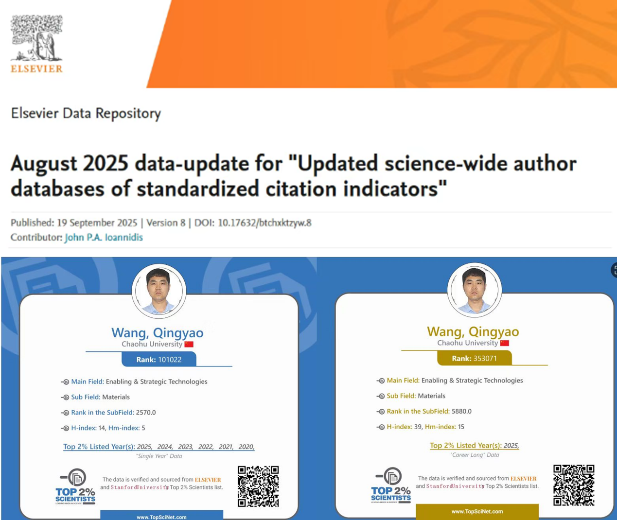 当地时间9月19日,美国斯坦福大学(Stanford University)和国际权威学术出版社爱思唯尔(Elsevier)共同发布2025年全球前2%顶尖科学家榜单(World's Top 2% Scientists)。机械工程学院王青尧教授再次入选“年度影响力”榜单和“终身科学影响力”榜单,彰显了其持续的学术影响力与科研贡献。