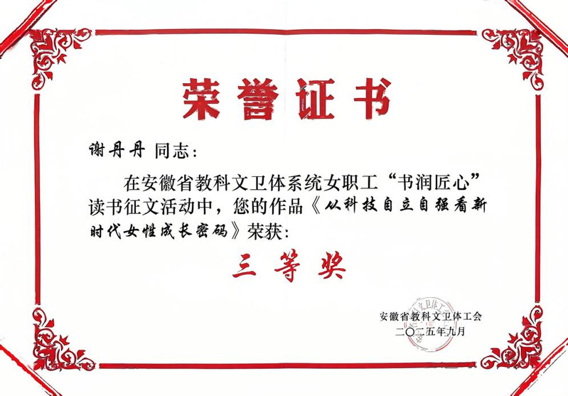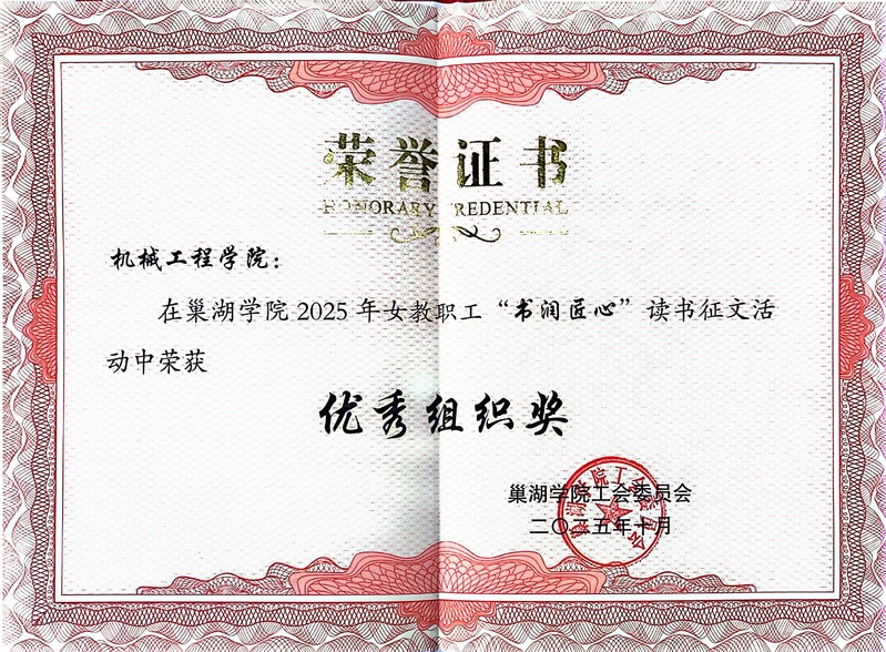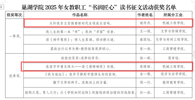 近日,学校工会和安徽省教科文卫体工会先后公布了2025年“书润匠心”读书征文活动评选结果,机械工程学院分工会在2025年Beat365唯一官方网站女教职工“书润匠心”读书征文活动中荣获优秀组织奖。