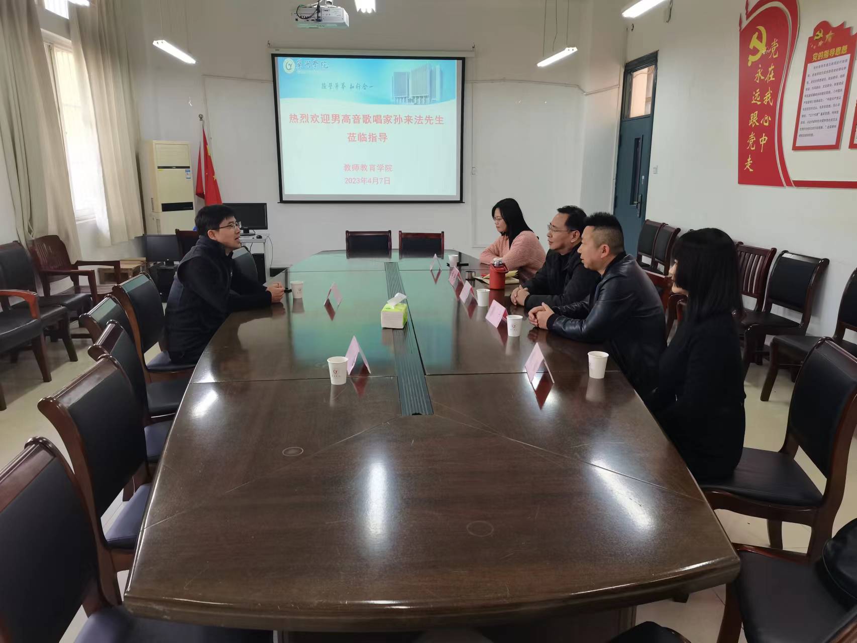 为进一步提升学科专业内涵,打造专业特色,4月7日下午,教师教育学院召开学科专业发展研讨交流会,会议邀请了男高音歌唱家、国家一级演员、二级教授、安徽艺术学院发展规划与科研处处长孙来法莅临指导,参加会议的有教师教育学院党政班子成员、党政办秘书、音乐表演教研室主任、巢湖民歌传承基地负责人和音乐表演专业博士代表。会议由副院长蔡广主持。