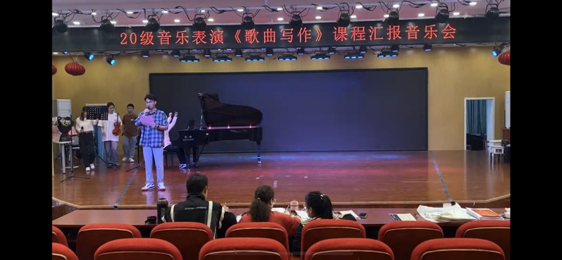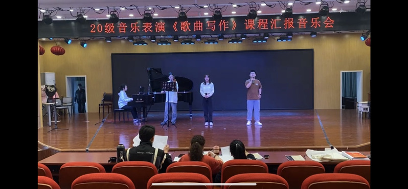 6月5日晚,由杨丹老师教授的20级音乐表演专业学生《歌曲写作》课程教学结课音乐会,在教师教育学院二楼音乐厅隆重举行。邀请周雨茜和周泽汉两位嘉宾老师进行现场评课。