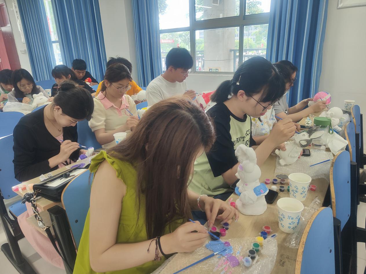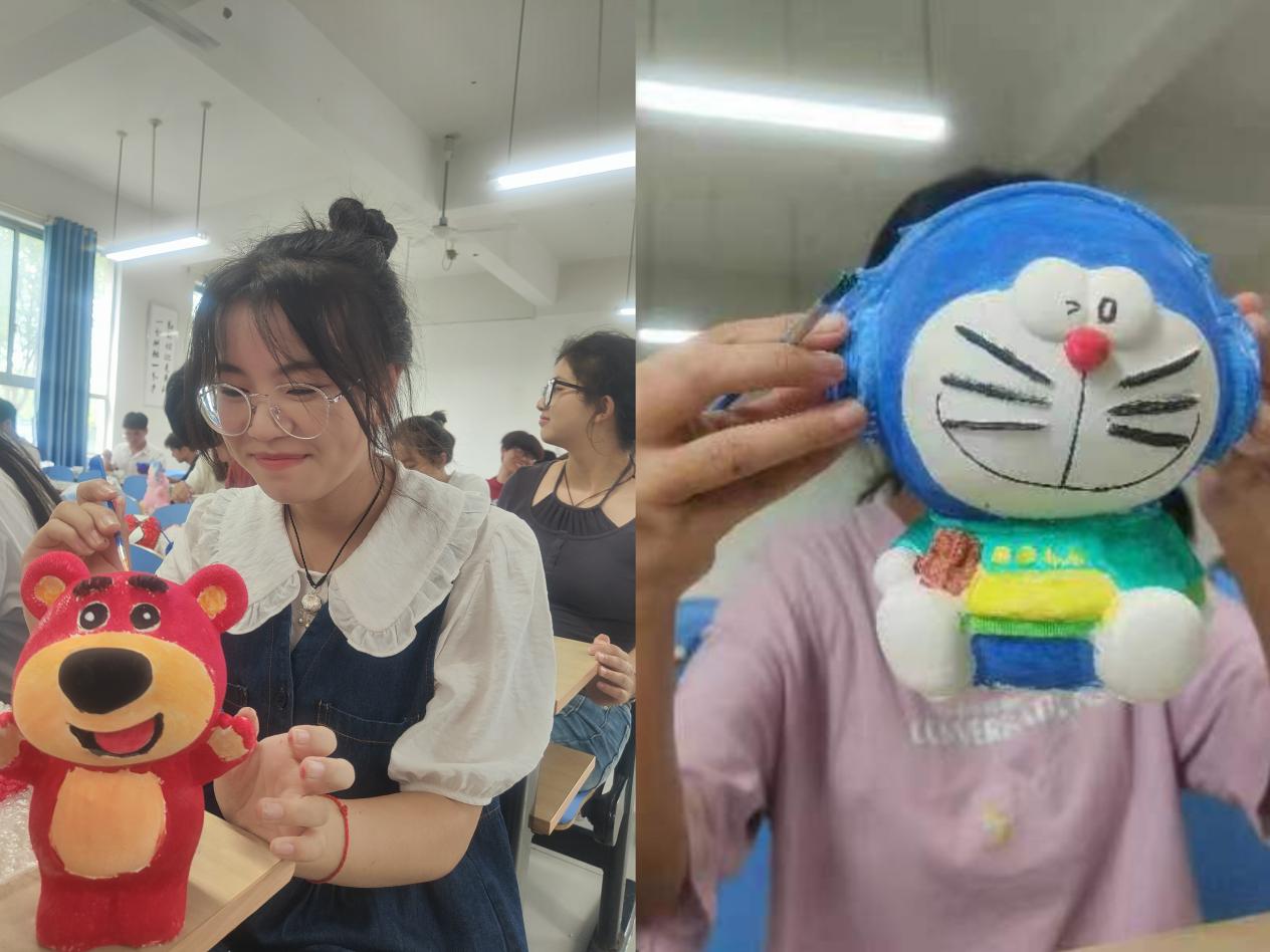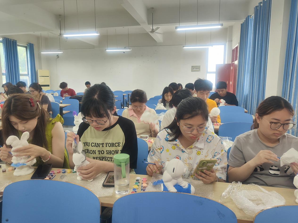 石膏娃娃是涂鸦作画的热门物品之一,同学们自行选择自己喜欢的石膏娃娃的模型和颜料在活动现场进行绘制。在舒缓的音乐中,一支支画笔游走在不同的绚丽色彩中,岁月的静好在快门按下的一瞬间凝结,记录下了同学们认真的模样,此刻吸引人的不只是色彩的碰撞,更是她们专注的面庞和别具一格的创新想法。