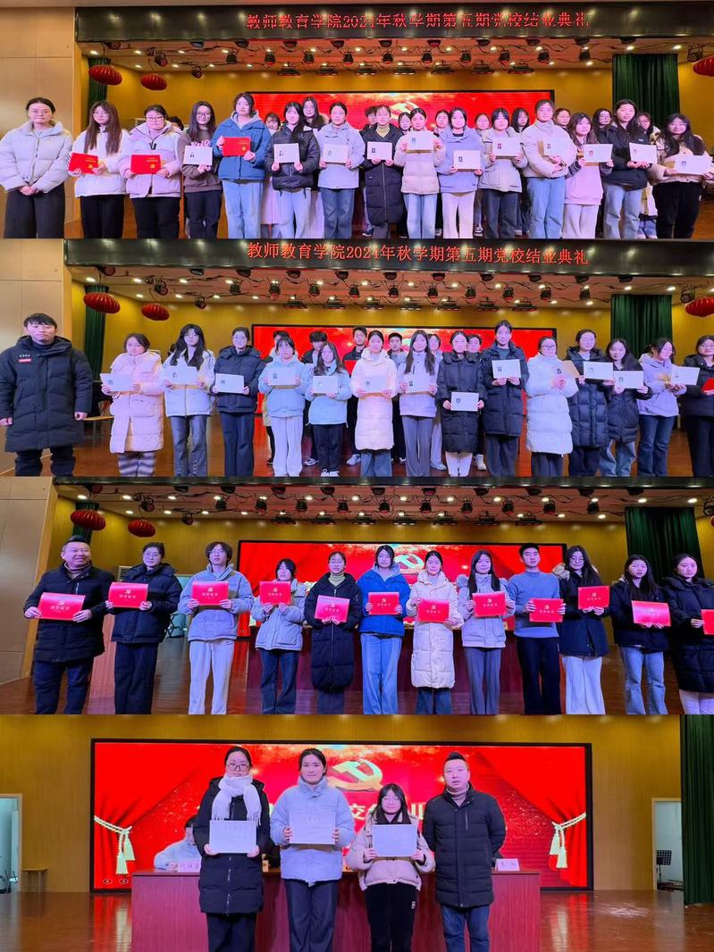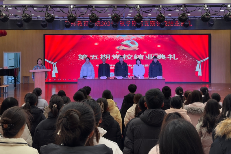 根据学院党委部署安排,2024年12月24日下午,教师教育学院第五期党校结业典礼在艺术楼报告厅举行。学院党委副书记、副院长蔡广出席会议并讲话,学院党委副书记左劲中,学生支部书记王相、汤重,支部副书记代佳鑫及学院2024秋学期49名全体积极分子学员、16名发展对象参加本次结业典礼。仪式由学院组织员刘杨主持。