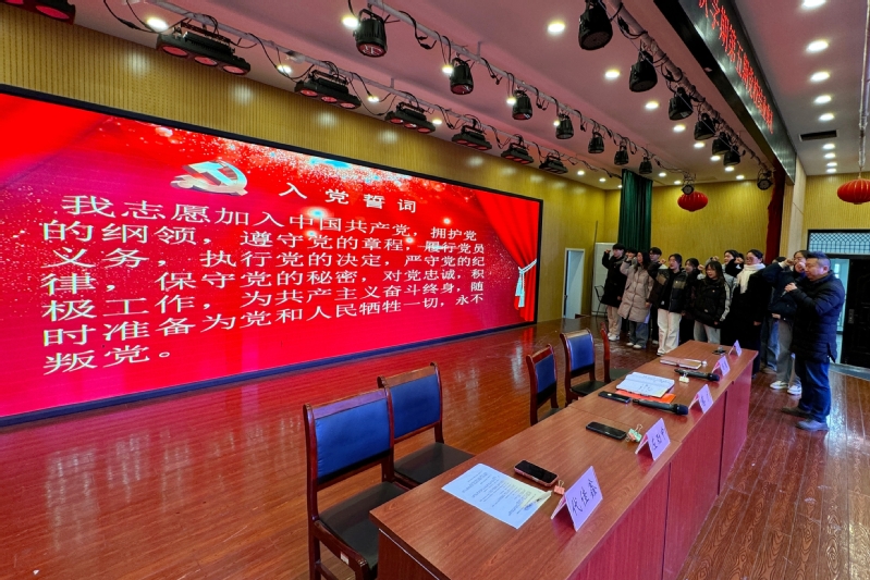 典礼现场,党员教师为刚刚吸收为中共预备党员的同志授予并佩戴了党员徽章,蔡广带领全体预备党员进行了入党宣誓。
