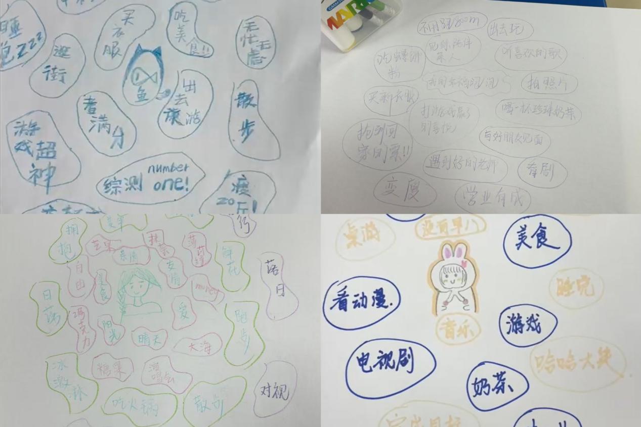 随后制作“我的幸福泡泡”环节,曹伊详细介绍了“幸福泡泡”的概念,并悉心讲解如何绘制属于自己的幸福泡泡。同学们专注倾听,纷纷拿起纸笔,认真勾勒心中幸福的模样。在绘制过程中,大家沉浸于对幸福瞬间的回忆与畅想,现场氛围温馨而美好。