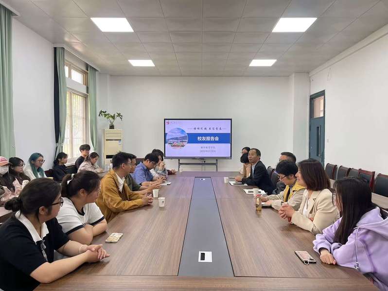 胡传双代表学院对两位校友的到来表示热烈的欢迎,赠送校友纪念品。他表示校友是学院的宝贵财富,校友的成功经验和奋斗故事是激励在校学生成长成才的生动教材,希望在校学生从校友的分析中汲取成长力量,奋力拼搏,不负韶华。