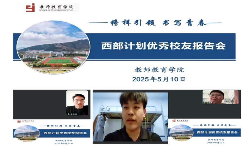 为鼓励和引导毕业生投身西部建设与发展,5月10日下午,教师教育学院举办西部计划优秀校友报告会。邀请李东阳、丁俊杰、张哲等3位2024年参加西部计划的志愿者,在线分享基层的青春故事。学院党委副书记左劲中、毕业班辅导员、部分2025届毕业生代表在线聆听。报告会由学院团委副书记汤重主持。