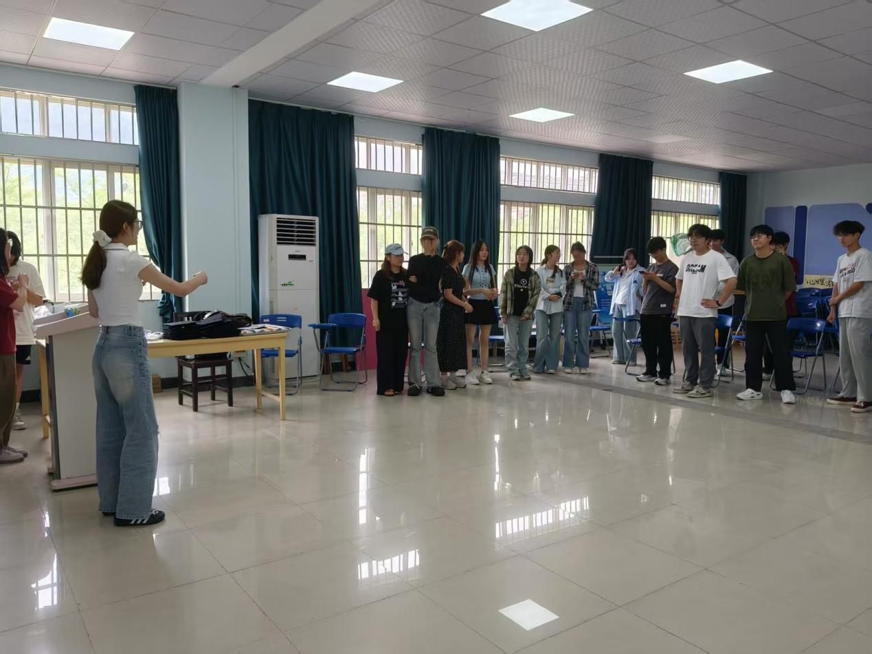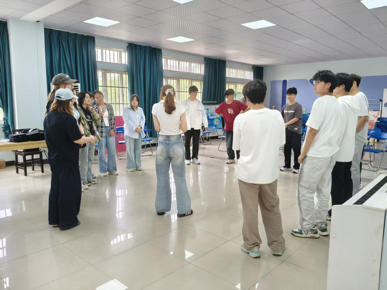 随后的创意设计竞赛将活动推向高潮。“手疾眼快”活动需参赛学生在主持人喊指令(如“摸左耳”“摸右肩”)时迅速做出相反动作,做错者淘汰。30个人分为5组,每组派组长出来应战,获胜组可优先选制作材料。大家为自己的小组加油呐喊,期待着满载而归的组长和接下来的簪花活动。