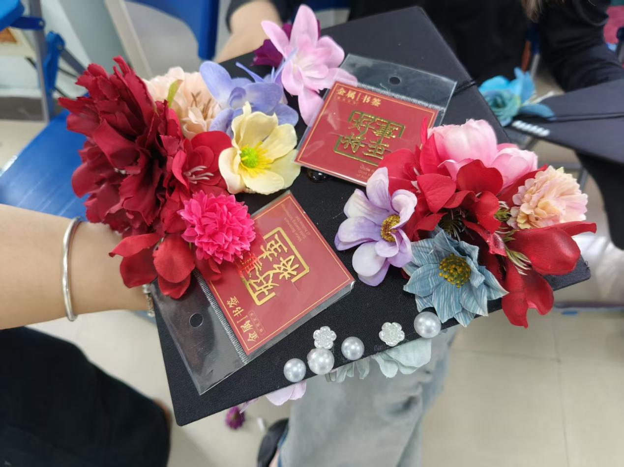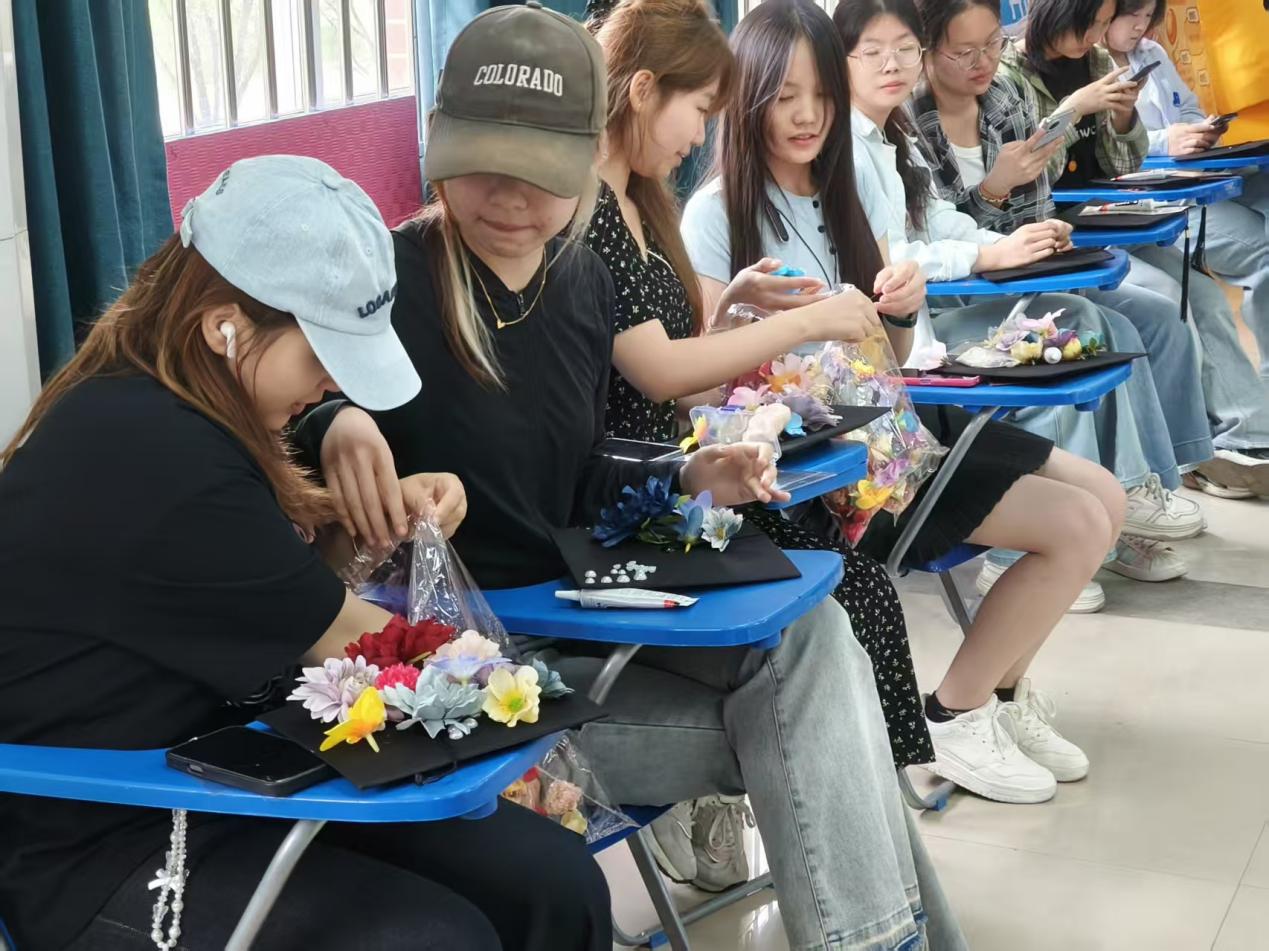 活动压轴环节是传统的学士帽簪花仪式。在老师的指导下,同学们将鲜花、珍珠等装饰品精心点缀在学士帽上。24级应用心理学专业孙悦同学说:“这次活动很精彩,虽然制作过程有点坎坷,但看到自己亲手做的学士帽,真的很能感受到毕业季的氛围。”通过这种手工形式,让同学们提前感受毕业文化,增强对学校的归属感。