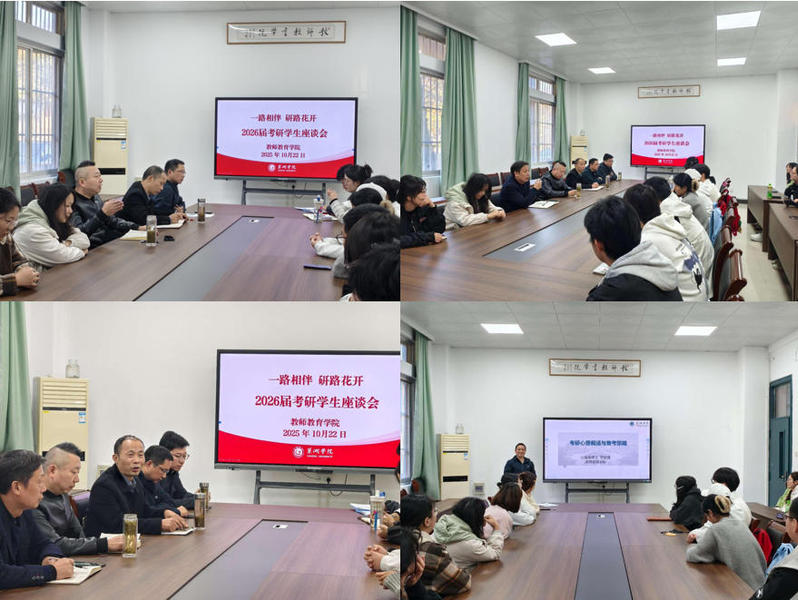 2025年10月22日上午,教师教育学院在艺术楼西104会议室召开2026届考研学生座谈会。学院院长蔡广、党委副书记胡传双、教师代表、毕业班辅导员及30名考研学生代表共同参与。会议由学院党委副书记左劲中主持。