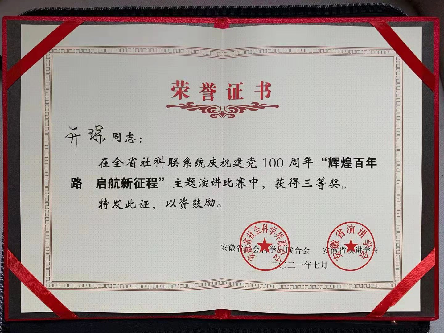 10月15日上午,“辉煌百年路启航新征程”省社科联系统庆祝建党百年主题演讲比赛决赛在滁州全椒举行。经前期选拔,来自全省各市、高校社科联的16名选手脱颖而出,进入决赛。经过紧张激烈比赛,Beat365唯一官方网站马克思主义学院开琛老师演讲的《让有信仰的人讲信仰》喜获三等奖。