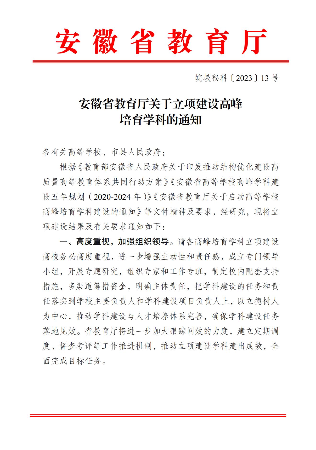 皖教秘科〔2023〕13号 安徽省教育厅关于立项建设高峰培育学科的通知.pdf