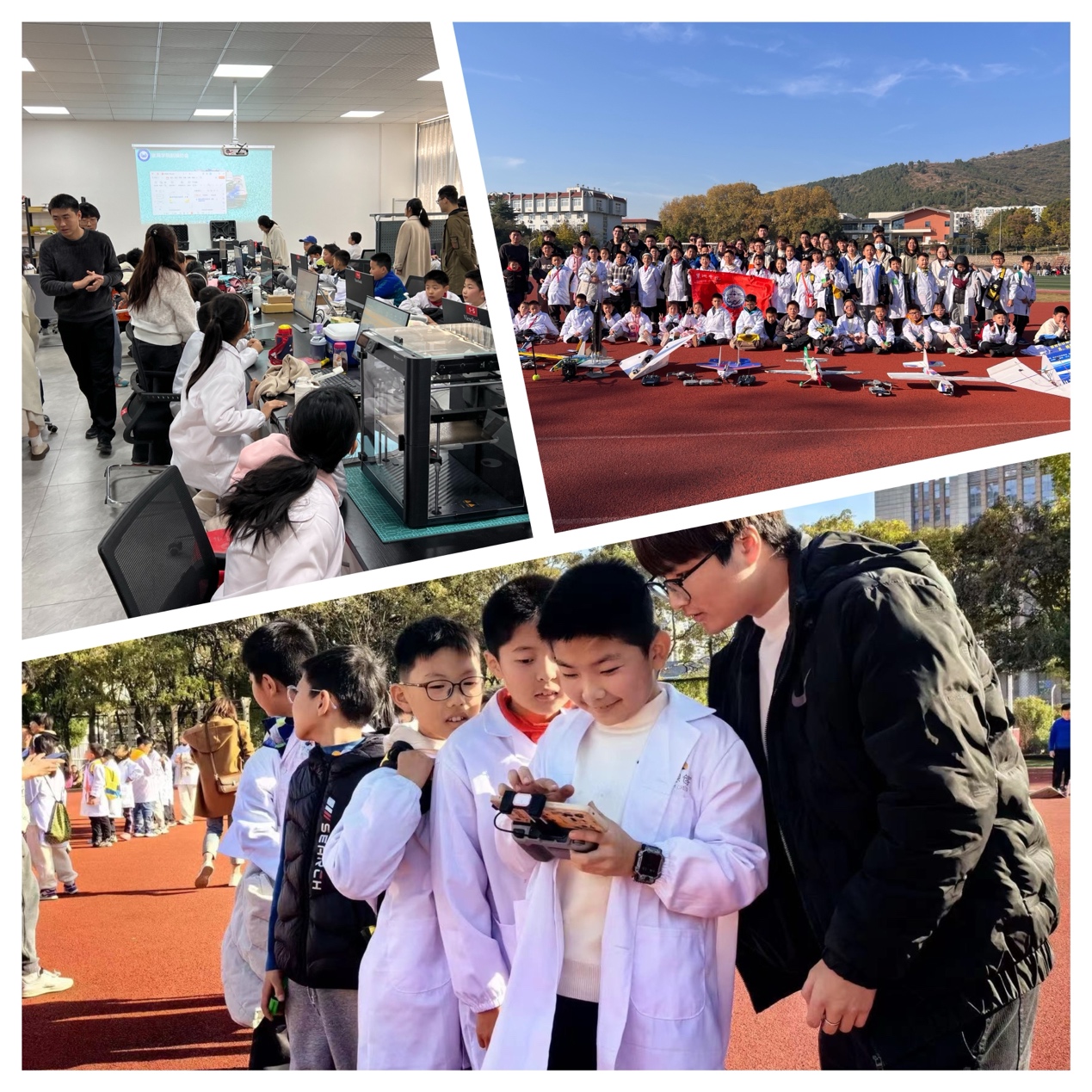中午孩子们在食堂自己打菜打饭,吃完收拾好餐盘送到回收处,提前体验了一把大学生活。稍作休息后,同学们来到第三站电子工程学院“1+X无人机实验室”,由校航模协会的老师和同学们带来航空知识教学,以及航模表演、水火箭表演和无人机实践飞行。操场上传来孩子们的阵阵尖叫,科学的“种子”此刻也在空中挥洒。