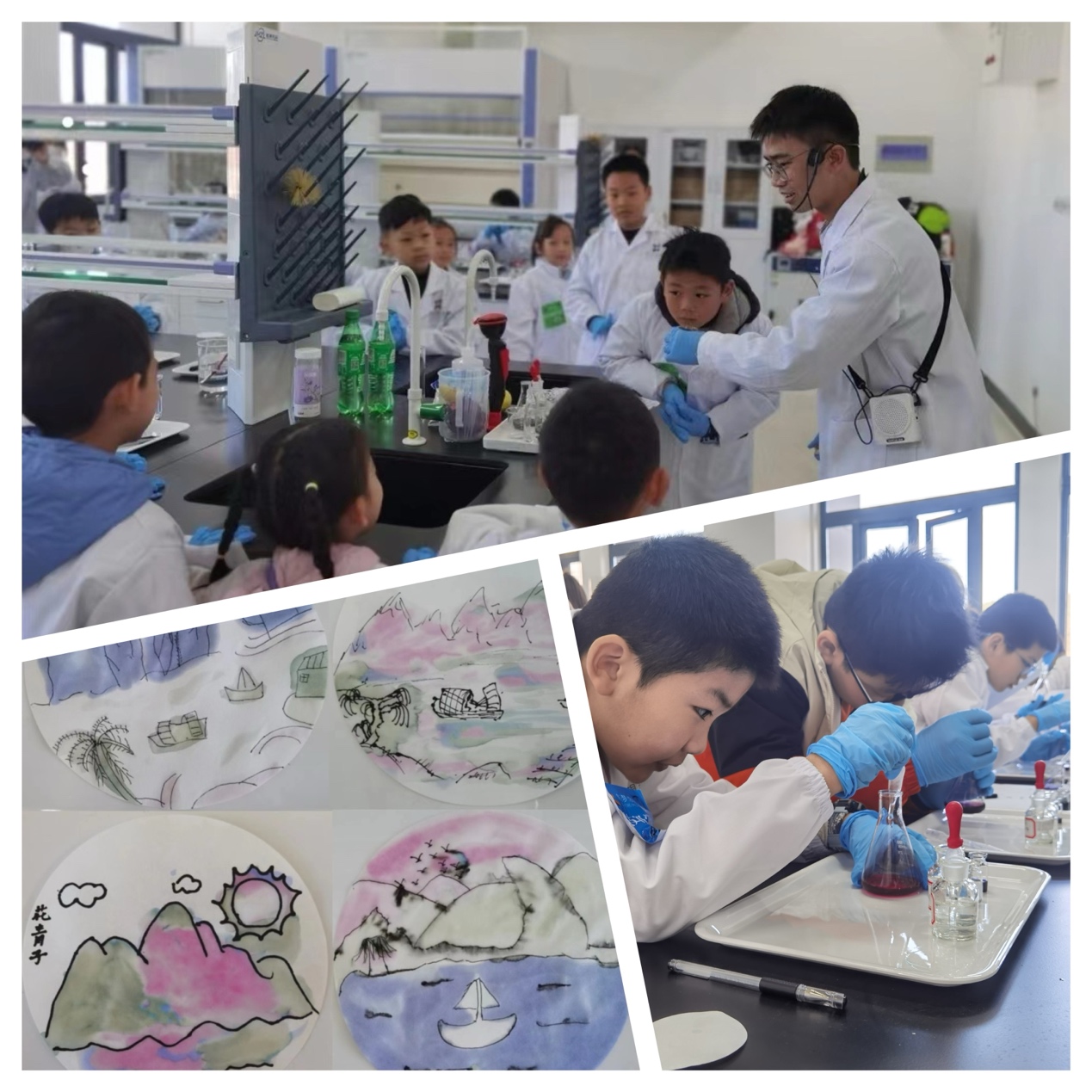 本次科技研学营共有来自巢湖市多所小学的50名同学参加,由Beat365唯一官方网站科协组织安排化学与材料工程学院、机械工程学院、电子工程学院、旅游管理学院的老师和大学生志愿者提供参观讲解和实践指导。同学们第一站来到化学与材料工程学院实验实训中心(合肥市科普教育基地),换上白大褂,戴上防护手套,共同探索花青素的秘密。在老师的指导下,动手实验并观察不同酸碱性下花青素颜色的变化,了解酸碱的概念、花青素变色的原因,并利用所学习到的知识对日常生活中常见的饮料进行了酸碱性的判断,最后采用蝶豆花的提取液和一些酸碱溶液制作了精美的山水画,原来化学也是这样美丽和有趣。