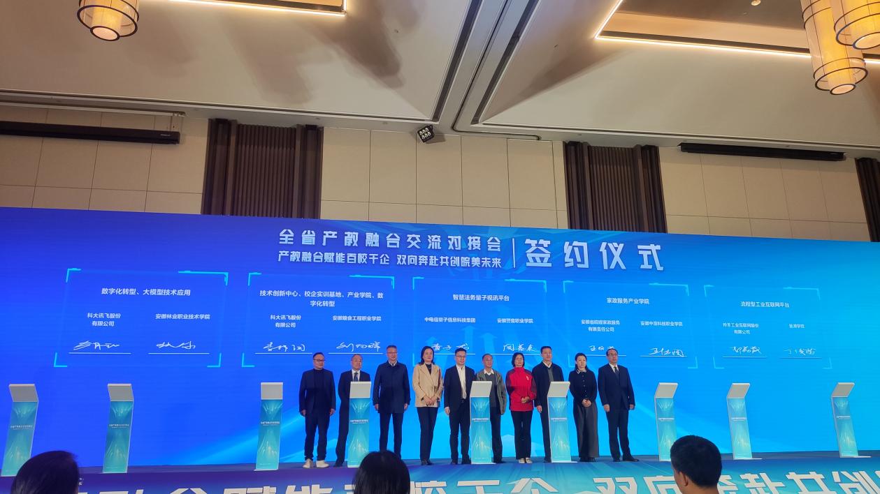 2023年11月22日,以“产教融合赋能百校千企 双向奔赴共创皖美未来”为主题的全省产教融合交流对接会在合肥召开。本次交流对接会由安徽省发展改革委主办,科大讯飞股份有限公司承办。党委委员、副校长丁俊苗带队参加并现场签约。