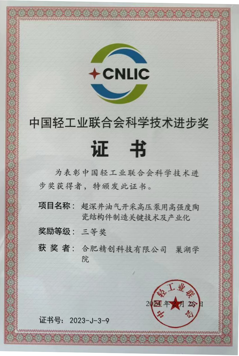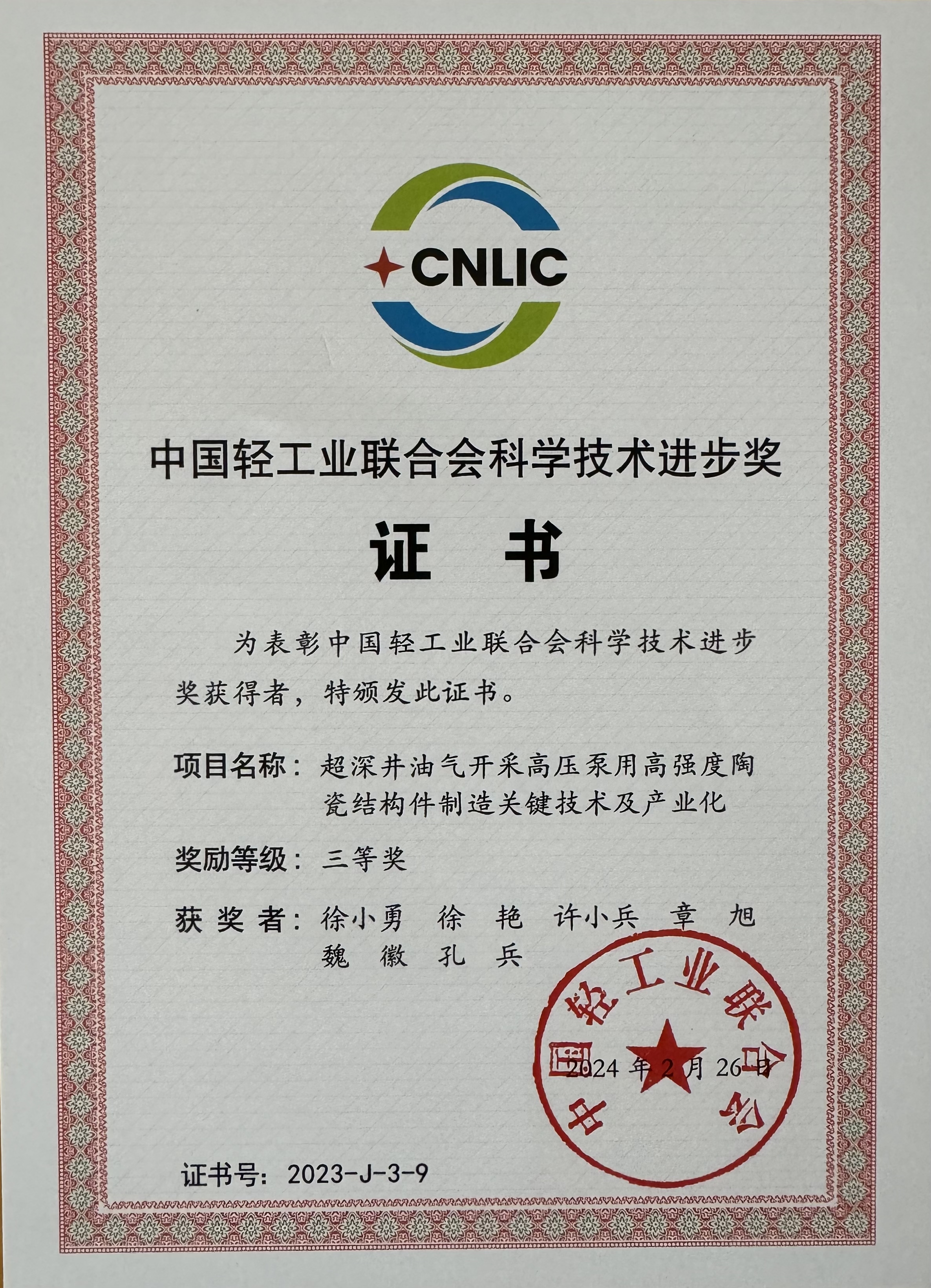 2024年4月8日,中国轻工业联合会五届四次、中华全国手工业合作总社八届四次理事会在四川广元召开,会上宣布了《关于2023年度中国轻工业联合会科学技术奖励的决定》并举行颁奖仪式,Beat365唯一官方网站功能陶瓷粉体材料与器件科研创新团队研究成果“超深井油气开采高压泵用高强度陶瓷结构件制造关键技术及产业化”喜获中国轻工业联合会科技进步奖三等奖。