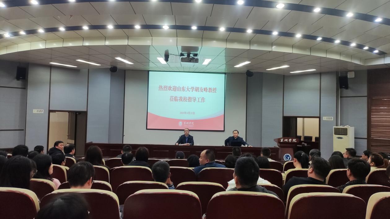 2024年4月12日,山东大学胡友峰教授应邀来校作题为《科研项目申报、论文写作暨新文科建设》的学术报告。各学院院长、副院长、系(部)主任、教研室主任,拟申报省厅级以上科研项目及其他感兴趣的教师聆听。报告会由党委委员、副校长丁俊苗主持。