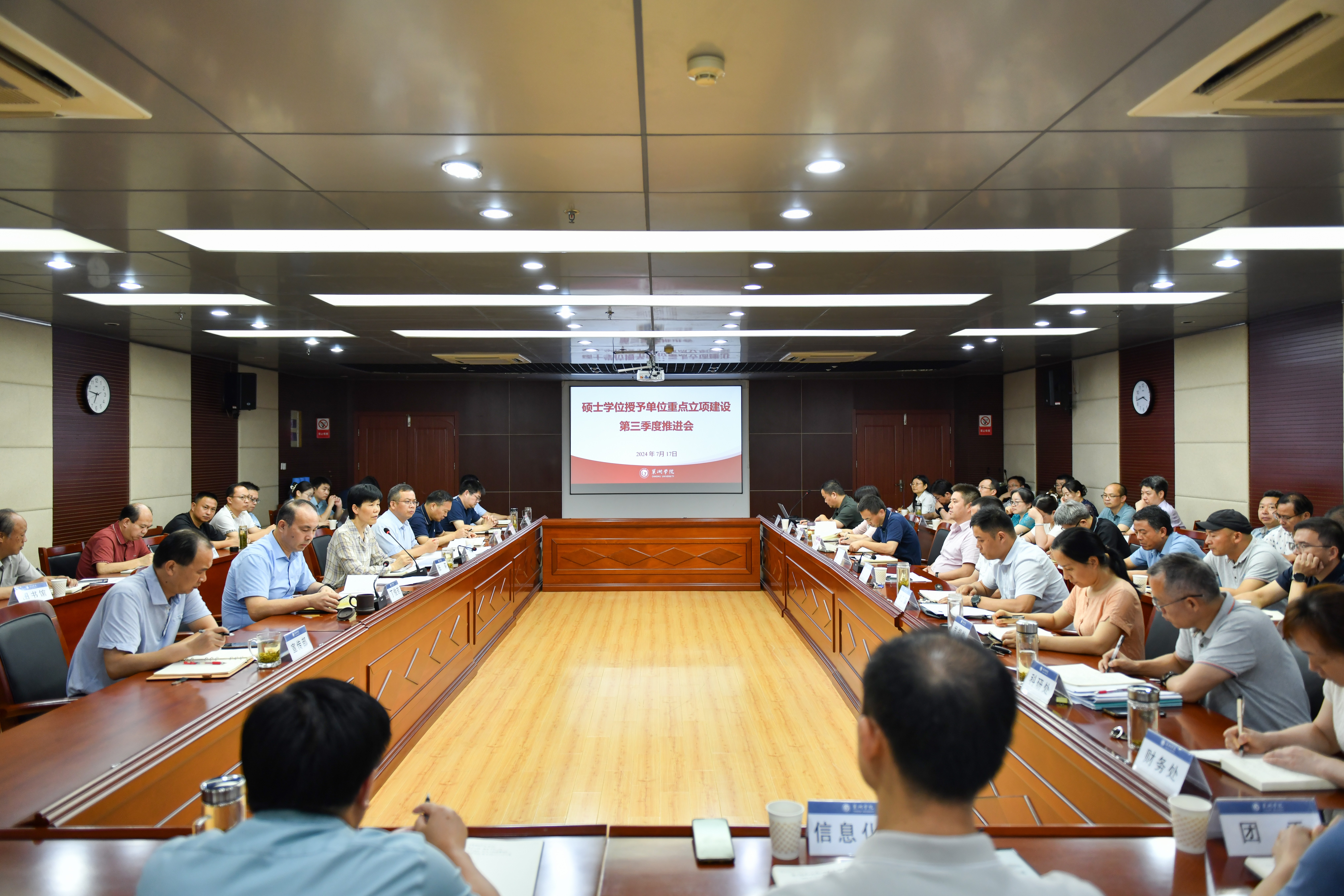 科研处处长姚磊围绕学校“申硕”基本条件、师资队伍与水平、人才培养与质量、科研水平与质量、整体支撑条件五个方面汇报了第二季度硕士学位授予单位重点立项建设工作进展情况。随后,人事处、教务处就师资队伍与水平、人才培养与质量等方面存在的问题及改进措施作内容补充。会上,丁俊苗指出,“申硕”工作时间紧、任务重,各单位一定要咬定目标、久久为功,要凝心聚力、充满信心,对下一步工作的开展,他提出两点建议,一是要全面对标对表,补缺补差;二是要集聚力量,着力解决重点难题。