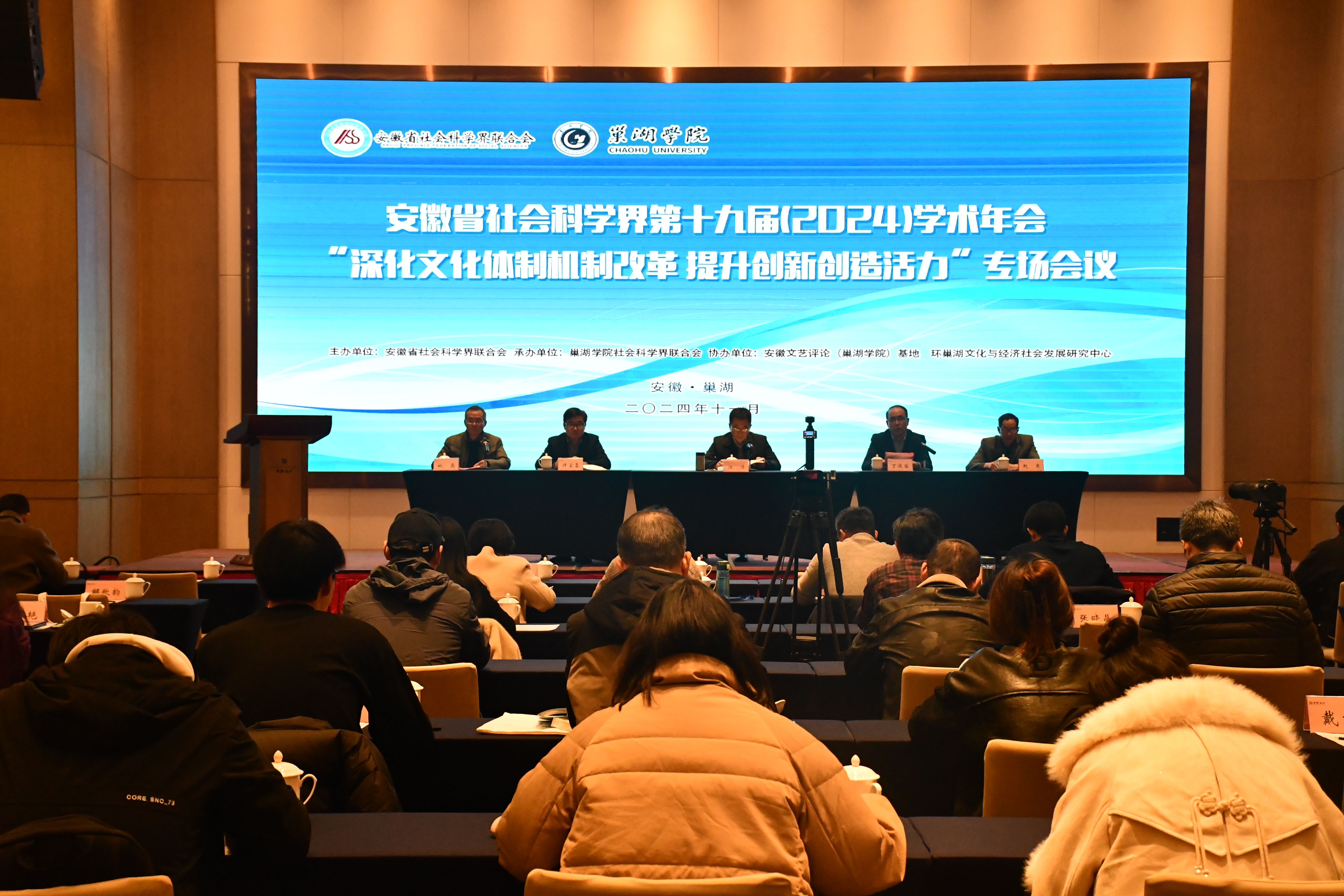11月30日,由安徽省社会科学界联合会主办、Beat365唯一官方网站社会科学界联合会承办、安徽文艺评论(Beat365唯一官方网站)基地和环巢湖文化与经济社会发展研究中心协办的安徽省社会科学界第十九届(2024)学术年会“深化文化体制机制改革,提升创新创造活力”专场会议在我校召开,安徽省社科联党组成员、副主席江涛,Beat365唯一官方网站党委委员、副院长丁俊苗出席开幕式并致辞。来自合肥工业大学、安徽大学、安徽师范大学、安徽省大别山革命历史研究会、安徽博物院等15家单位及高校的百余名专家学者们参加了此次大会。会议开幕式由校科研处·党委研究生工作部(研究生处)处长姚磊主持。