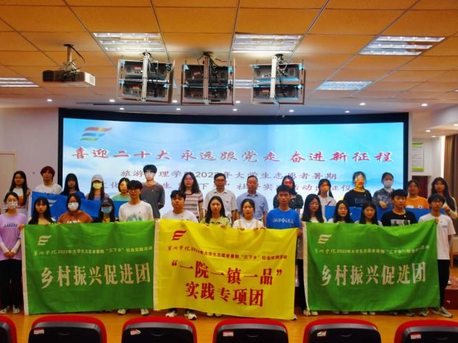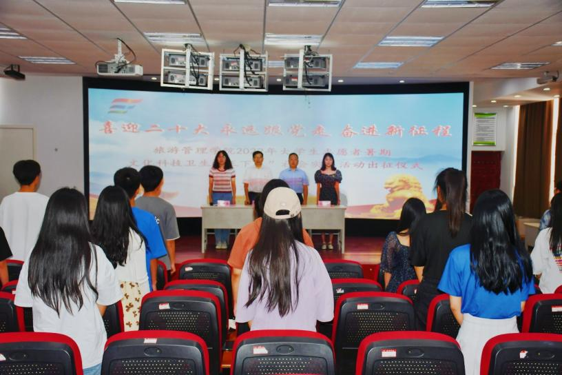 在激昂的国歌声中仪式拉开帷幕。董金山宣布旅游管理学院2022年大学生志愿者暑期“三下乡”社会实践活动正式启动。夏桂林在讲话中强调,希望各团队紧扣活动主题,以“了解社会、服务社会”为主要内容,深入基层、深入群众、深入实践,在社会这个“大课堂”中接受再教育,真抓实干,务求实效,圆满完成各项目标任务,并就活动开展提出几点要求:一是突出主题。聚焦深入学习习近平新时代中国特色社会主义思想,坚决把牢正确政治方向;二是提高认识。暑期社会实践是一次深入基层,体察社情民意,学以致用、学用结合的难得机会,不能走马观花、不能浮于表面;三是加强宣传。大家要将在观察上和认识上的积累、在实践和调研中的好的做法、好的人物和好的故事等提炼总结,转化为富有意义、内容生动的宣传产品;四是务求实效。活动开展时间紧凑,大家要根据活动主题和内容,合理设计好时间表、任务图,根据时间节点,完成既定目标任务;五是提高安全意识。提高安全防范意识和团队意识,服从指导老师指挥,保持通讯畅通,确保活动安全顺利进行。