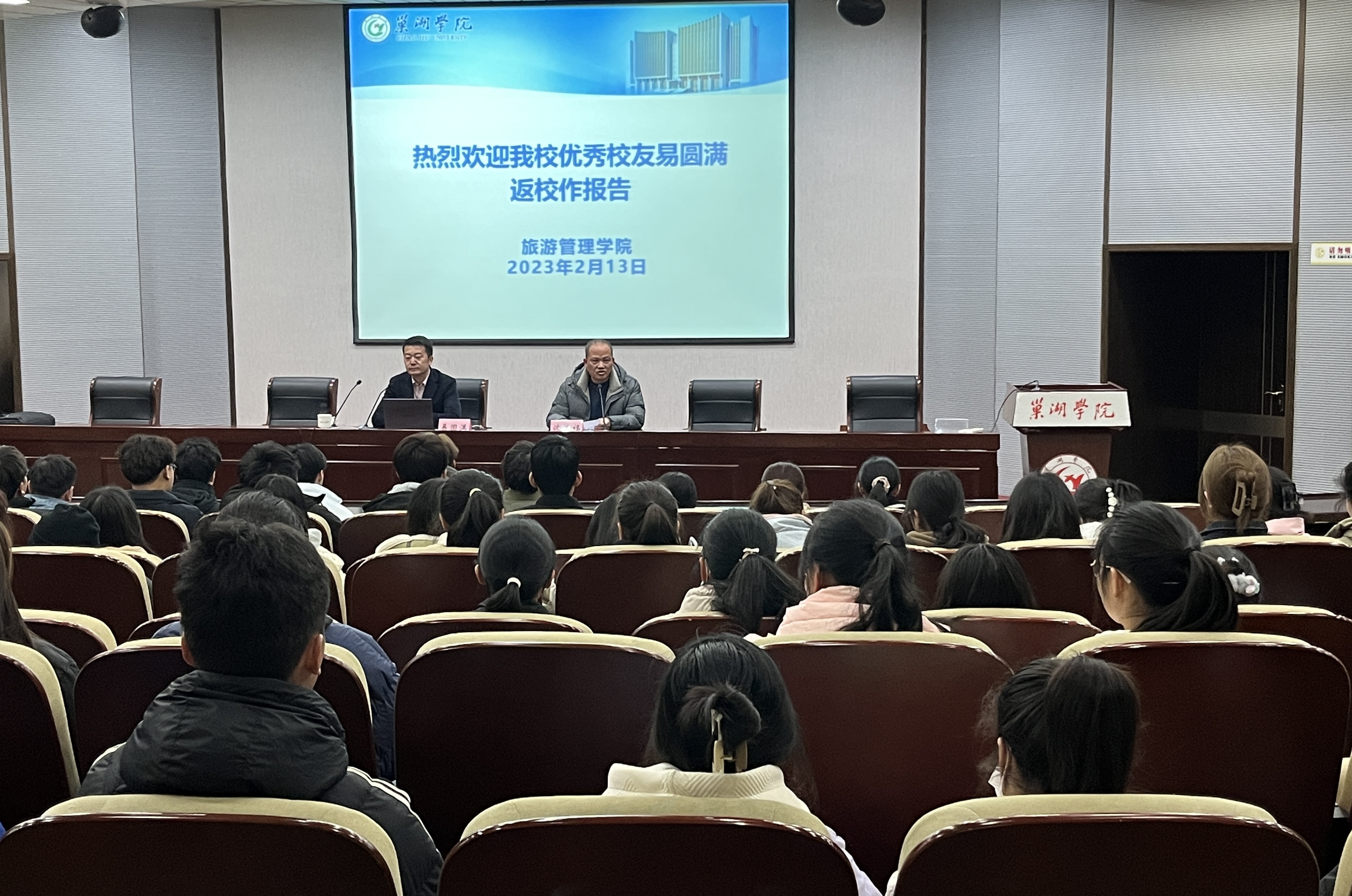 为进一步发挥优秀校友的示范引领作用,引导学生明确学业目标和职业方向,增强专业认同感,树立专业荣誉感,2月13日下午,旅游管理学院在致知楼学术报告厅举办优秀校友专场报告会,特邀旅游管理学院2007届优秀学子、富悦(上海)酒店管理有限公司总经理易圆满进行经验分享。本次报告会由旅游管理教研室主任沈德福主持,旅游管理学院2022级旅游管理专业、会展经济与管理专业全体学生参加。