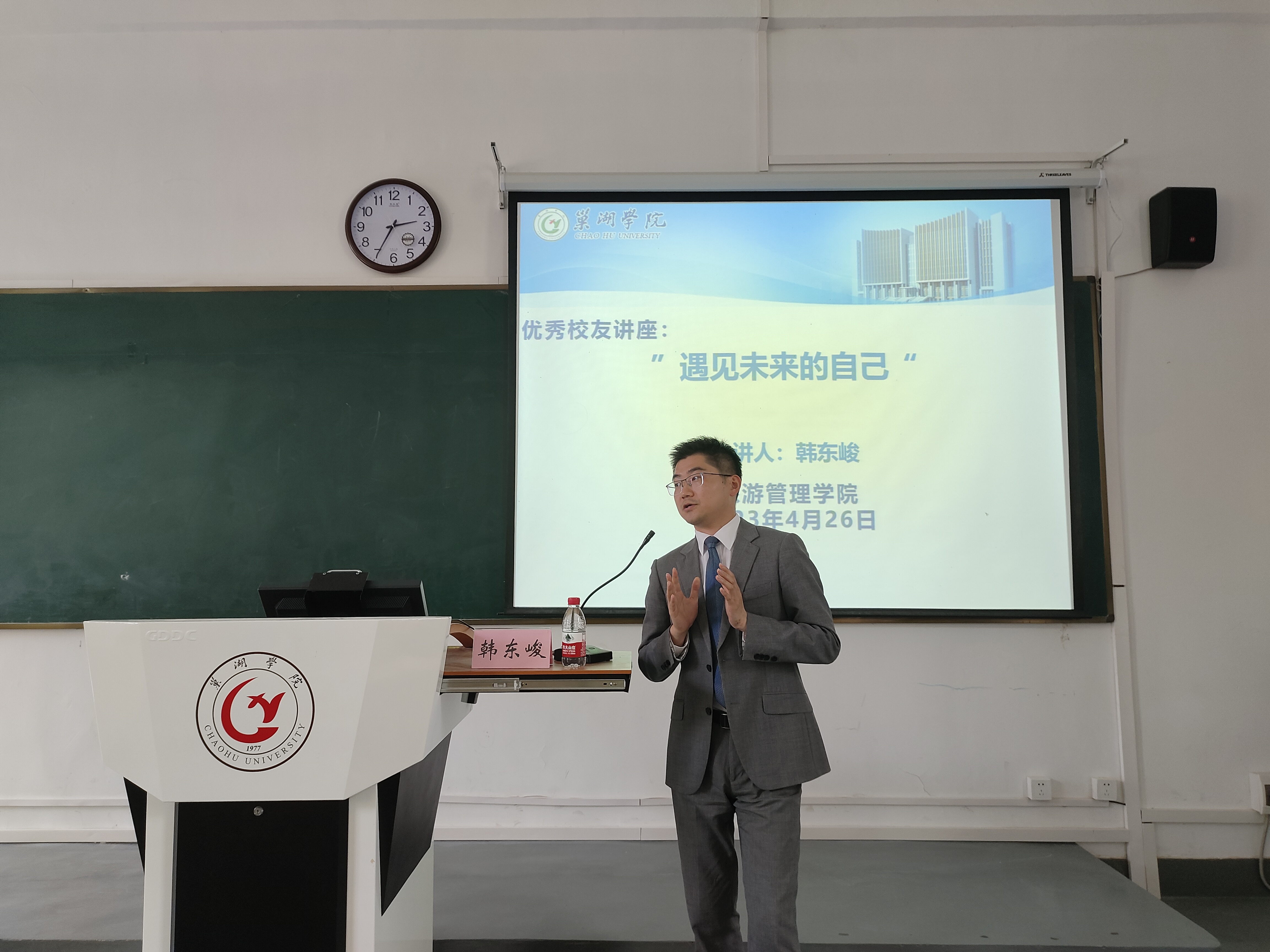 “文化旅游产业是一个跨行业的朝阳产业,旅游管理专业前景广阔,为大家提供了施展才华的广阔空间……”。在江苏溧阳市项目部,刚与母校签订实习就业基地合作协议后,旅游管理学院2012届优秀校友、江苏涵田旅游产业投资集团有限公司人力资源负责人韩东峻马不停蹄地赶回母校,往返近400公里,为旅游学院学子作了一场题为“遇见未来的自己”的报告,用自己的成长经历来吸引更多的旅游管理专业学生投入到新时代文旅事业中。