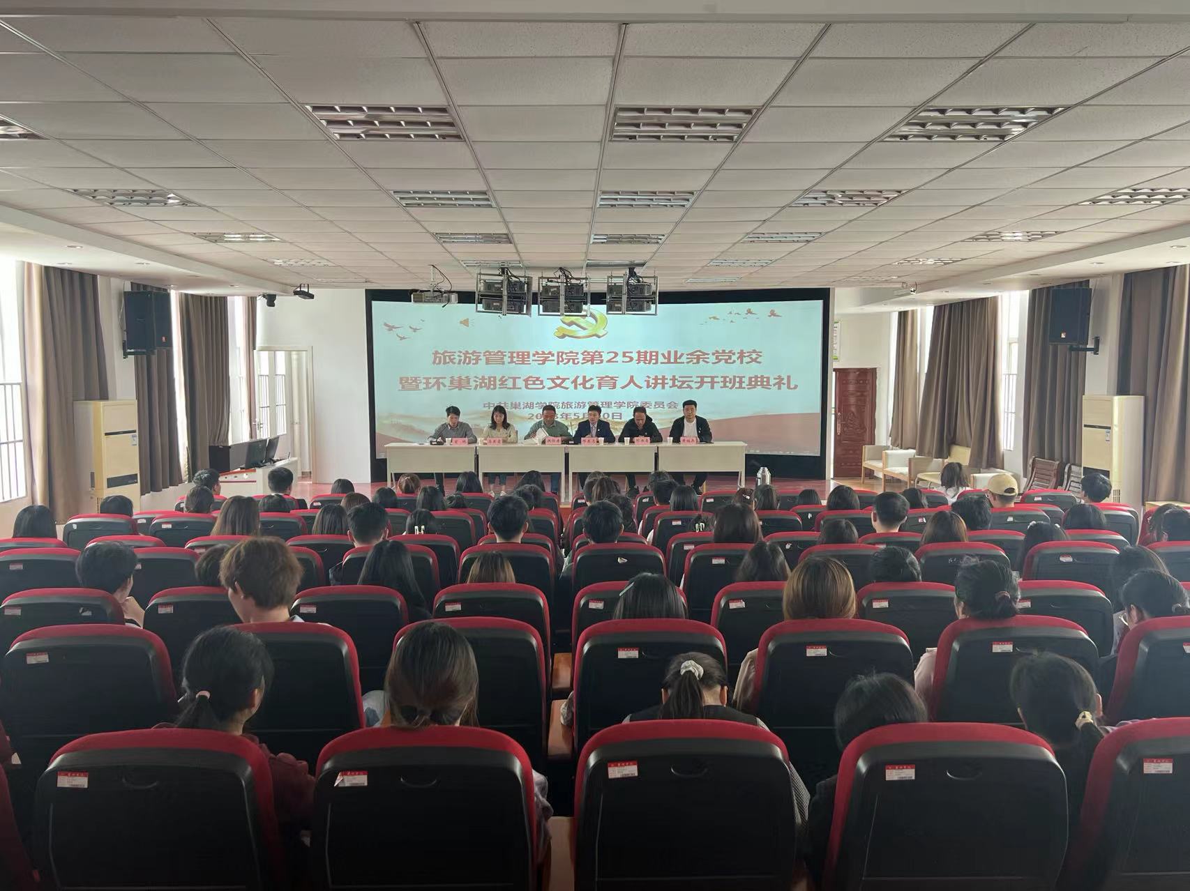 5月10日,旅游管理学院第25期业余党校暨环巢湖红色文化育人讲坛隆重开班。学院党委主要负责人洪作奎、副书记邓其志、学生支部书记马其霞、黄维兵、邓书音出席典礼,21名发展对象和63名入党积极分子参加开班仪式。开班典礼由党校班主任曾鹏主持。