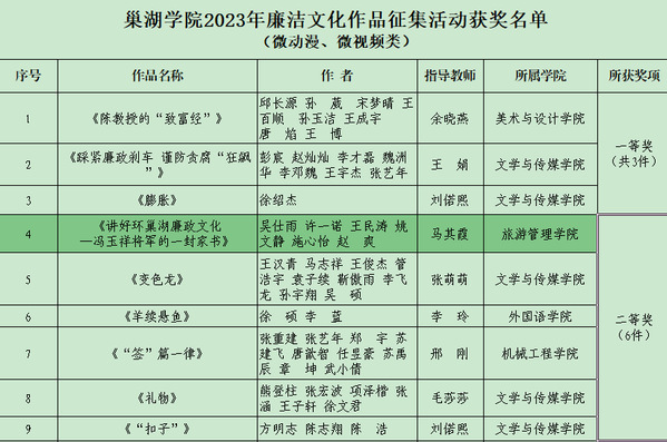 日前,学校公示了2023年廉洁文化作品征集活动评选结果,旅游管理学院报送的《讲好环巢湖廉政文化故事—冯玉祥将军的一封家书》荣获微动漫、微视频类二等奖。