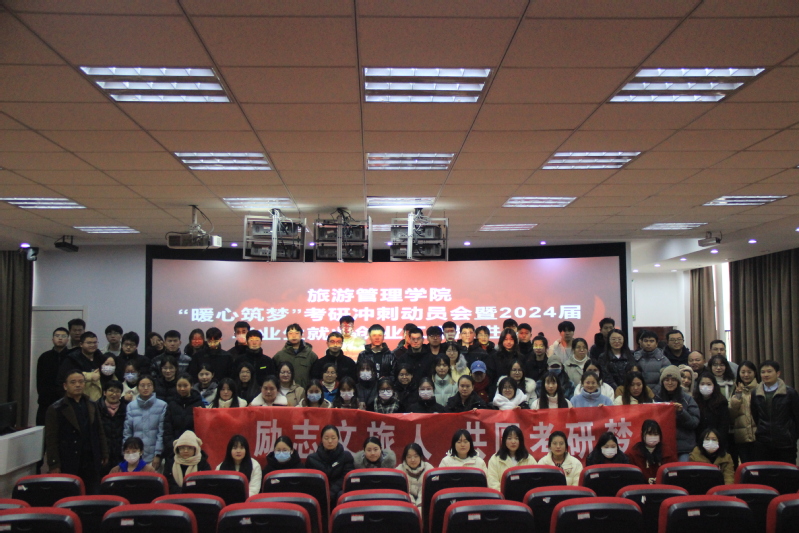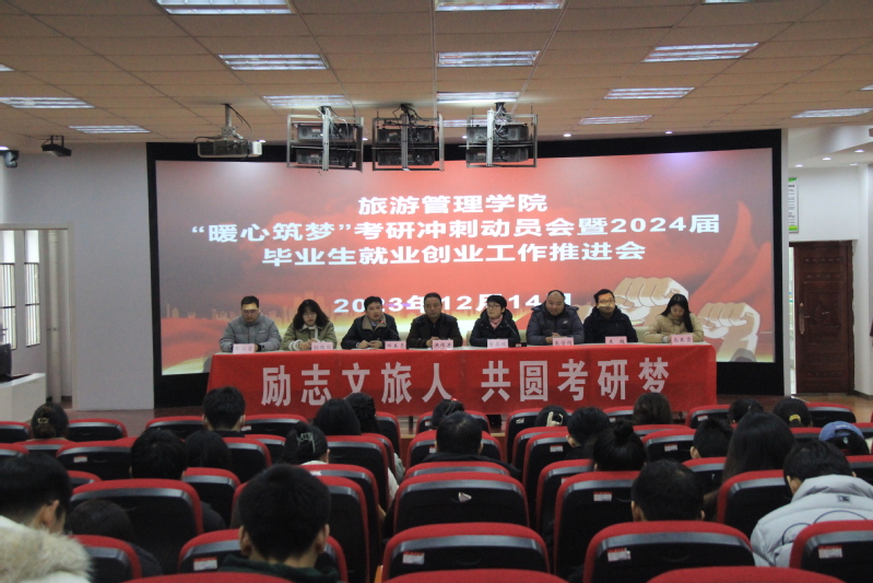 12月14日中午,博学楼3D模拟导游大厅内气氛热烈,在2024年研究生入学考试即将来临之际,旅游管理学院隆重召开“暖心筑梦”考研冲刺动员会暨2024届毕业生就业创业工作推进会,为学院近百名考研学子加油鼓劲。学院领导班子成员、毕业班辅导员及考研同学参加活动。