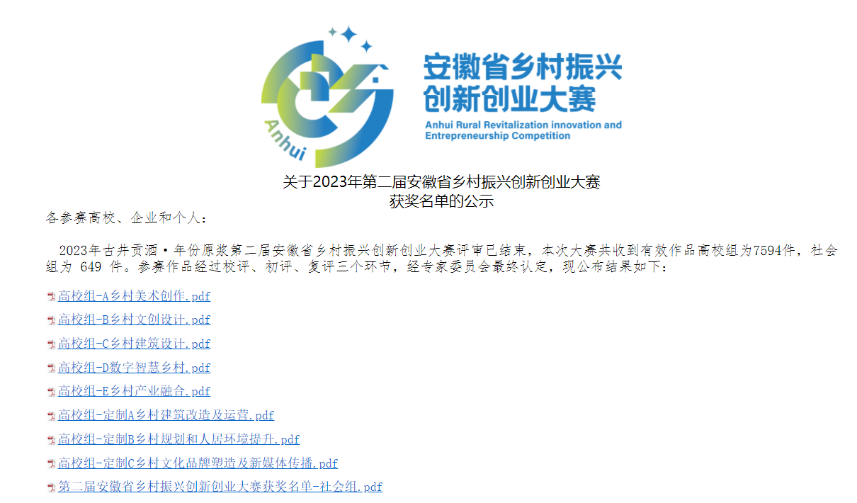 安徽省乡村振兴创新创业大赛旨在落实安徽省委省政府《关于实施“千村引领、万村升级”工程加快建设彰显徽风皖韵的宜居宜业和美乡村的意见》《创业安徽行动方案》,扎实推动“百校联百县兴千村”行动不断谋深走实,助力打造具有徽风皖韵特色的宜居宜业和美乡村。大赛开始以来,旅游管理学院精心组织,开展了动员培训、实地调研、打磨作品等工作,并邀请组委会专家来校进行宣讲和指导。经过最终选拔,学院选送了乡村产业融合、乡村规划和人居环境提升(定制赛道)、乡村文化品牌塑造及新媒体传播(定制赛道)三个赛道40余件作品参加省赛。