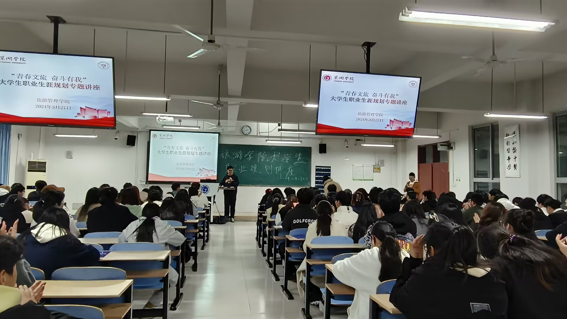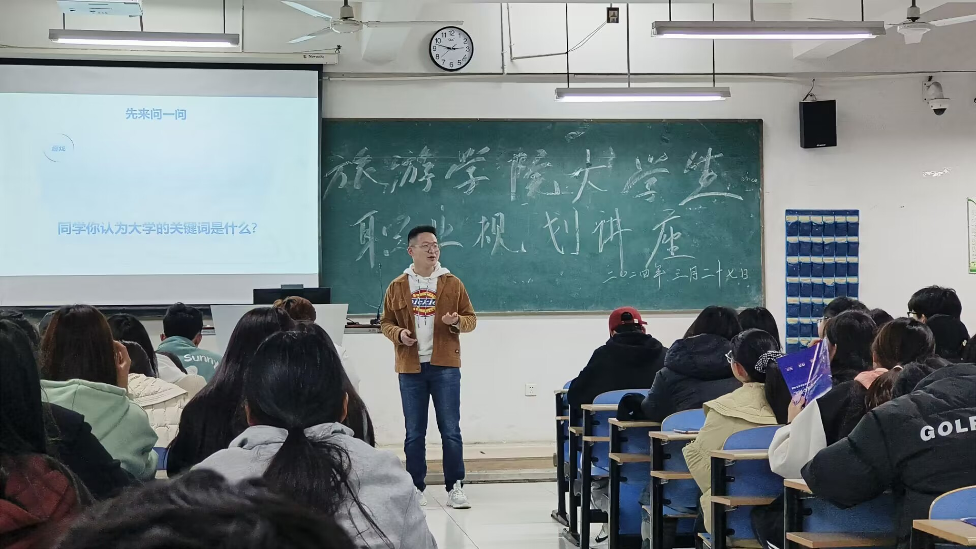 为帮助学生树立职业规划意识,强化学风建设,3月27日下午旅游管理学院在慎思楼中201教室开展职业生涯规划专题讲座。本次讲座由学院团委副书记(挂职)徐浩然主持,邀请新东方教育集团职业规划讲师担任主讲,23级部分学生参加。