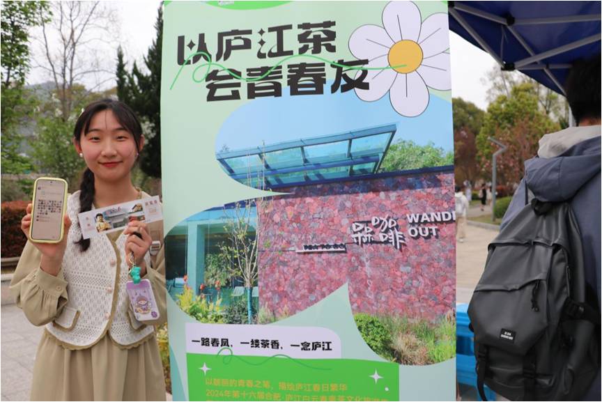 活动现场,庐江文旅局工作人员通过茶艺表演等形式展示了白云春毫茶文化有关知识,详细介绍了庐江县的旅游线路的特色景点、美食推荐以及旅行攻略。在互动环节,特色鲜明的画册、地图、文创等庐江文旅宣传品吸睛出圈,新采现泡的白云春毫绿茶清香扑鼻,多种形式呈现了庐江文旅的独特魅力。旅游学院学子通过向前来驻足的师生介绍茶文化、在微信朋友圈等平台点赞方式,宣传推介茶文化。