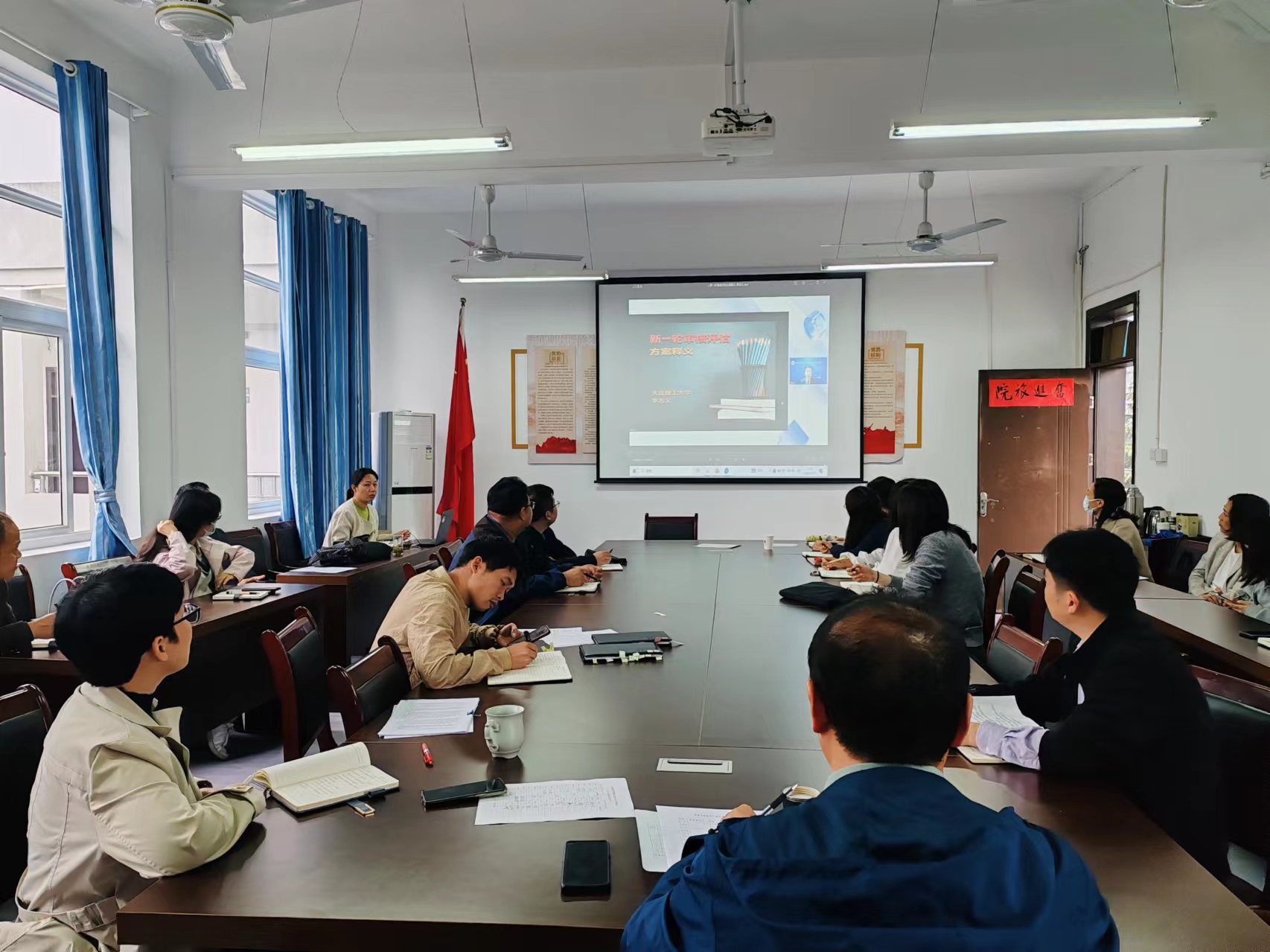 会议分两阶段进行。第一阶段,根据学校《关于组织开展本科教育教学审核评估专题培训的通知》的相关要求,与会教师就新一轮本科教育教学审核评估的重要特点、实施要点进行了视频资料学习与研讨。第二阶段,雷若欣就新一轮审核评估的18个要点进行了二次梳理,尤其在实习实训、课程资源库建设、教学材料完善与改进、教学质量活动月活动开展等方面做了具体要求。
