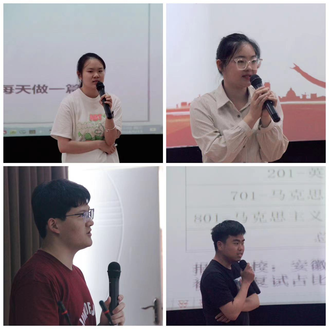 交流分享环节,已经考取辽宁大学的王佳乐、安徽师范大学的朱丰泉、浙江工商大学的梁佳莹、安徽工业大学的葛航等四名同学从专业选择、复习资料搜集、复习方法、心态调整等方面分享了考研历程和心得;报考安徽省选调生的石小龙同学通过现场展示部分笔试例题,让同学们对公考考试的题目有了更直观的了解,详细向大家分享了笔试面试的备考技巧与方法;已经成功入职知名企业的张效琪同学从简历打磨、岗位匹配度、面试准备等方面传授求职经验。活动中,几位同学对现场提出的相关问题进行了细致答疑。