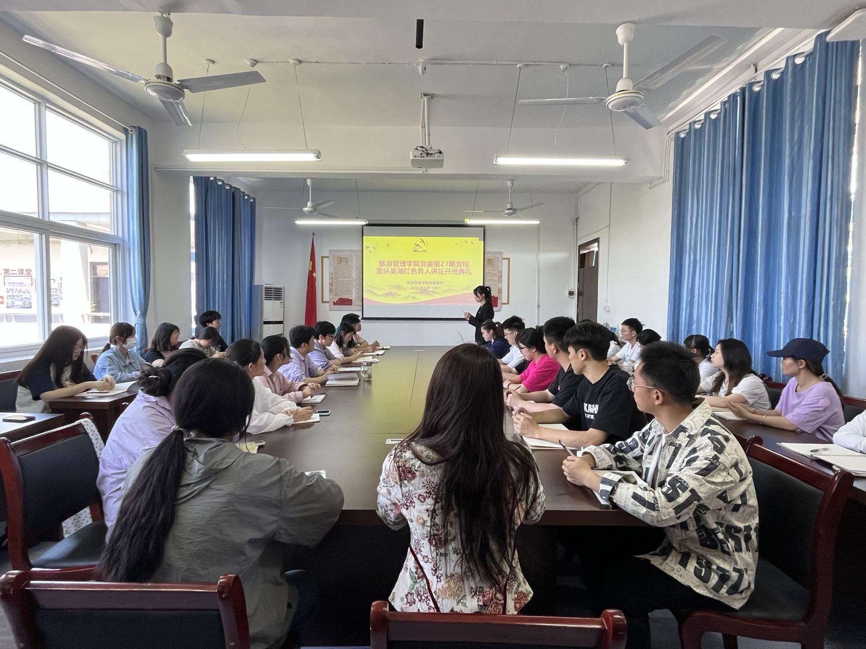 5月16日中午,旅游管理学院党委第27期党校暨环巢湖红色文化育人讲坛隆重开班。学院副院长雷若欣、党委副书记、纪委书记邓其志,学生支部书记马其霞、黄维兵、徐浩然出席典礼,34名入党积极分子参加开班仪式。开班典礼由党校班主任曾鹏主持。