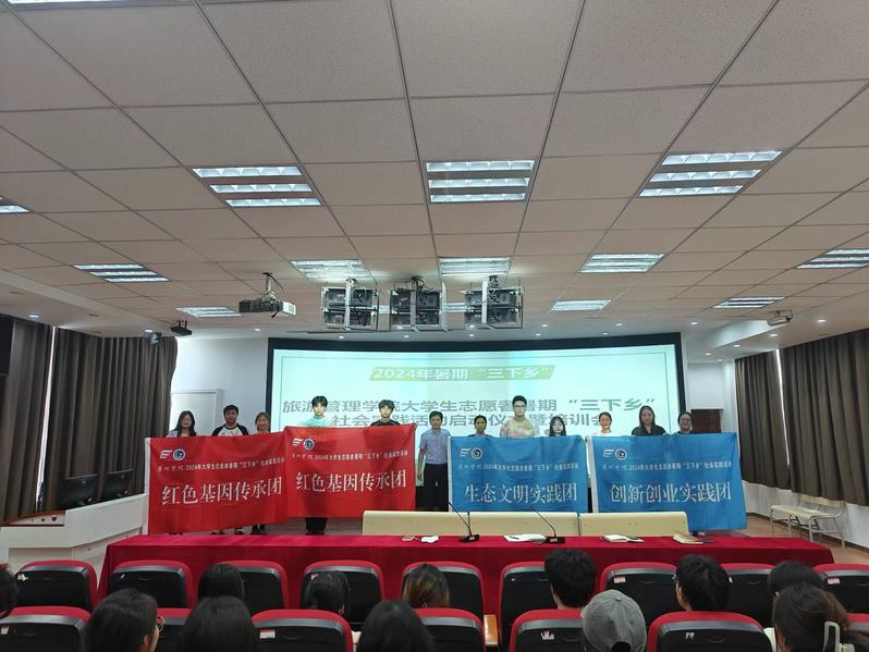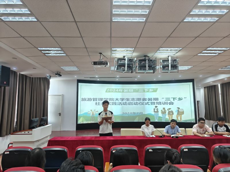 7月8日下午 ,旅游管理学院在博学楼3D 导游室开展2024年暑期“三下乡”社会实践活动启动仪式暨培训会。学院党委副书记邓其志,团委书记马其霞,辅导员黄维兵、徐浩然出席会议,近 150名暑期“三下乡”社会实践活动成员参会。会议由学生会执行主席胡欣宇主持。