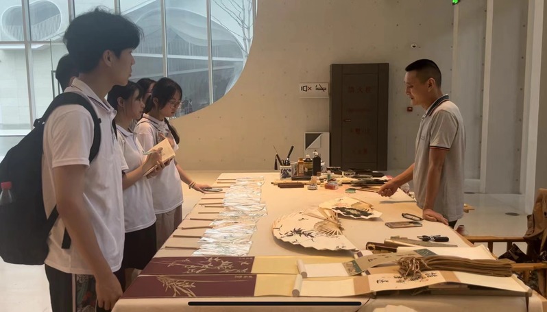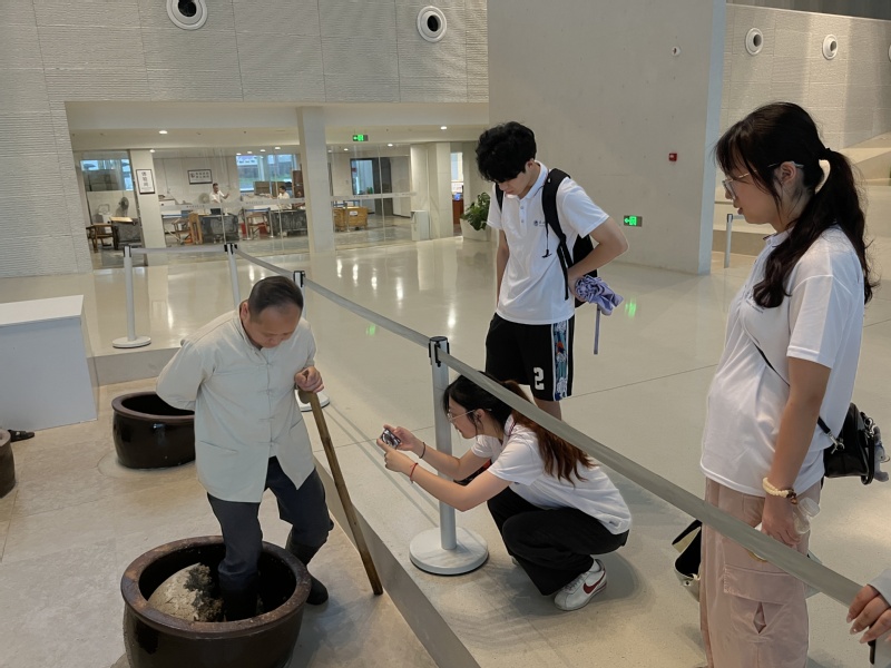 “宣纸制造不仅仅是一项技艺传承,更加体现了严谨、一丝不苟、精益求精的工匠精神,每一步都凝聚着匠人的智慧与汗水。”在中国宣纸文化园内,讲解员吴仕雨正为实践队员介绍宣纸制作流程。坐落在皖南泾县乌溪境内的中国宣纸文化园,主要由宣纸古作坊、文房四宝体验园、宣纸及世界纸陈列馆、书画廊(含书画家工作室)、文房四宝与书画市场、古籍印刷与江南民俗园等七部分组成,队员们依次参观了文化园各个板块。在老师傅指导下,实践团成员亲身体验了宣纸制作过程中的水捞、贴洪、抄捞等环节,了解了宣纸制作选材、晒纸、质检等各个流程。大家深刻体会到宣纸制作不仅需要足够耐心,同时还需要操作者眼、手、心巧妙地结合在一起,只有这样“捞纸”流程才能如行云流水,一气呵成。