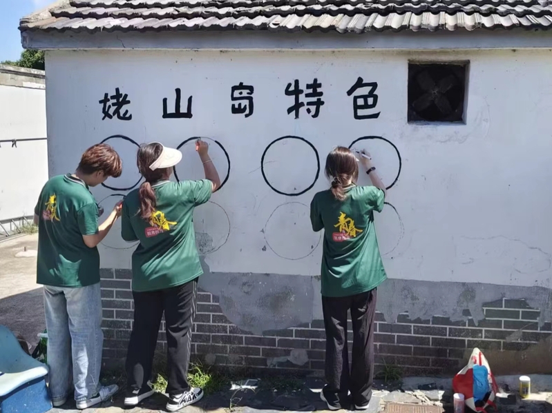 墙绘一直是姥山岛的网红打卡点。为帮助景区提升文化创造力和影响力,走可持续性发展路径,助力美丽乡村建设,实践团成员不顾炎炎烈日,尽情挥洒汗水,在墙壁上绘制出具有姥山岛特色文化的关键词和图案,“焦母文化”“淮军文化”“古船塘”等岛上历史旅游文化元素跃然“墙上”。除彩绘外,实践团还对因长时间风吹雨打导致墙皮脱落、颜料暗沉的墙绘进行了修复,还原了墙绘的本来样貌。