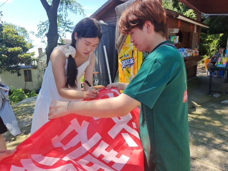 为倡导游客在游玩过程中遵守基本行为规范,减少对姥山岛自然环境破坏,维护生活环境,实践团进行文明旅游宣讲,引导大家文明礼貌出游,不乱扔垃圾,呼吁居民及游客遵守公共秩序、文明就餐,保护文物古迹、爱护公共设施,并提醒游客出行时注意自身安全。游客们主动在横幅上签名打卡,承诺文明旅游,共同维护姥山岛旅游秩序,营造一个整洁、优美、绿色的乡村环境和文明旅游氛围。