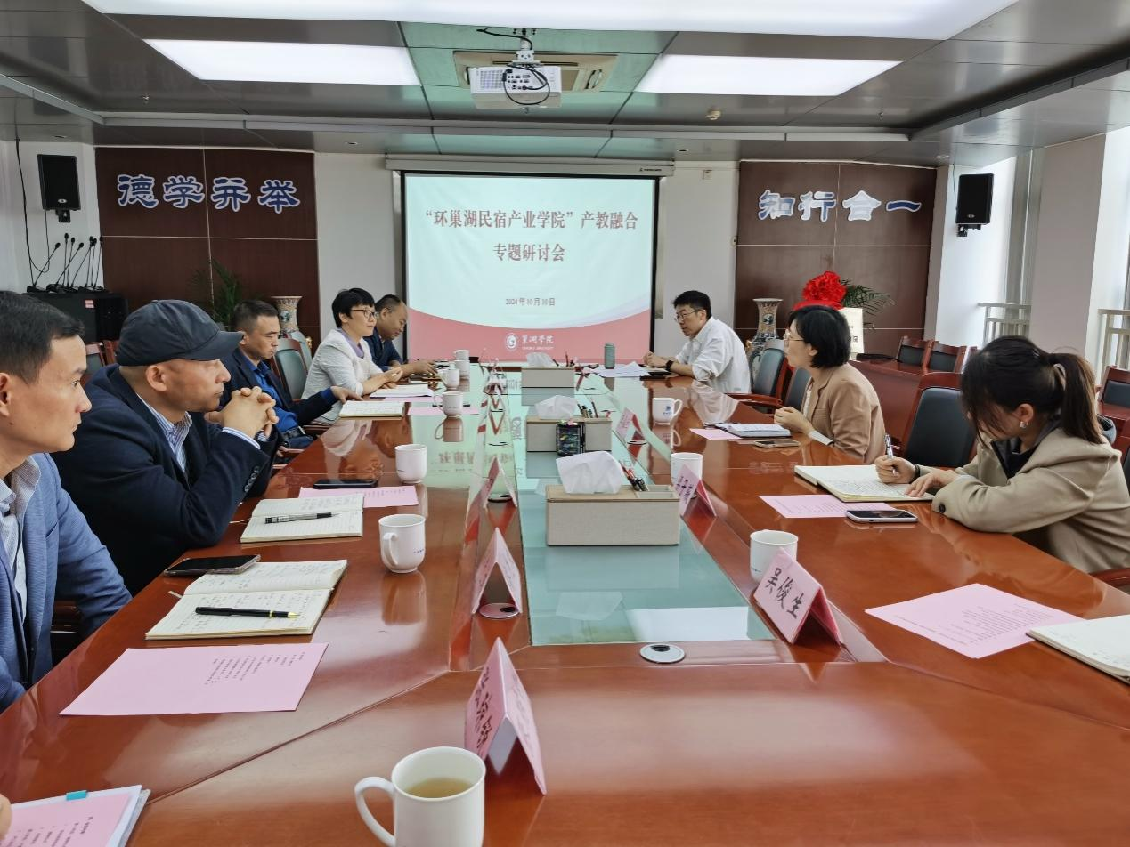 第二阶段为产教融合专题研讨会。王凤兰局长就庐江县文旅产业发展状况做了主题发言,特别提出了在民宿产业发展过程中遇到的问题与痛点,希望学校能在专业人才培养与输送、企业员工系列培训、民宿产业问题研究等具体方面给予相关支持;云里安凹总经理吴璐、环巢湖生态发展有限公司经理梁子薇也分别从民宿运营、产教融合等方面提出了许多宝贵意见和建议。教务处、体育学院、国际交流与继续教育学院、旅游管理学院等部门主要负责人就下一步产业学院可开展的具体业务进行了充分研讨。