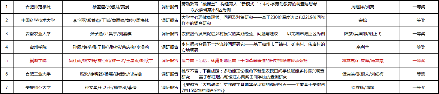 近日,2024年“新时代•新思想•新青年”安徽省大学生学习马克思主义理论成果大赛评审结果公布。旅游管理学院22级会展专业吴仕雨、姚文静、施心怡、许一诺、王星雨、胡欣宇等同学的作品《追寻南下记忆:环巢湖地区南下干部革命事迹的田野探赜与传承弘扬》荣获调研报告类一等奖(一等奖全省共11篇);旅游学院邓其志、马其霞被评为优秀指导教师。