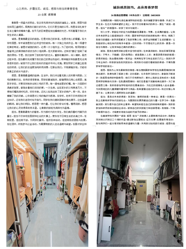 此外,学院结合学生资助日常工作,引导学生积极参与主题征文,同学们结合自身经历和感悟,用文字抒发对诚信感恩担当的赞美与追求,一篇篇真挚感人的文章,充分展现了新时代大学生的精神风貌。同时,学院还开展了宿舍卫生清洁劳动活动,多措并举,力求将诚信、感恩、担当意识转化为大学生的自觉素养和行为习惯。(文/黄维兵 图/各班级 初审/曾鹏 终审/洪作奎)