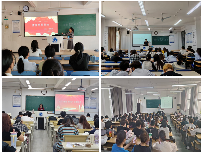 活动期间,学院各年级专兼职辅导员深入班级召开“诚信•感恩•担当”主题班会,集中向同学们讲解国家、学校资助政策和金融征信知识,提醒同学们注意防范金融网信诈骗,进一步提高学生对诚信、感恩重要性的认识,让学生们围绕诚信、感恩、担当展开热烈讨论,明确作为当代大学生需要树立受助诚信、考试诚信、学术诚信的观念,营造“诚信·感恩·担当”的良好氛围。