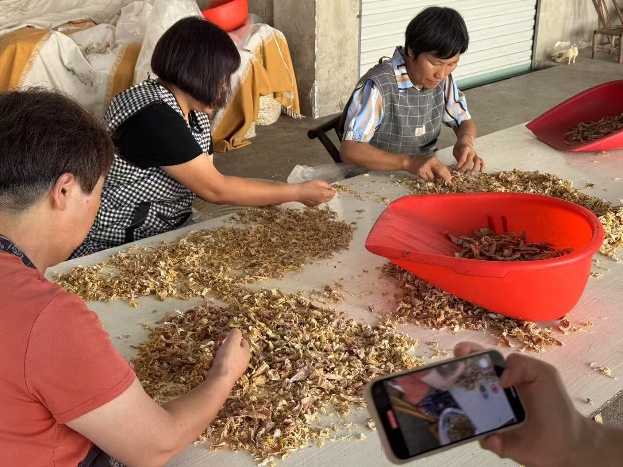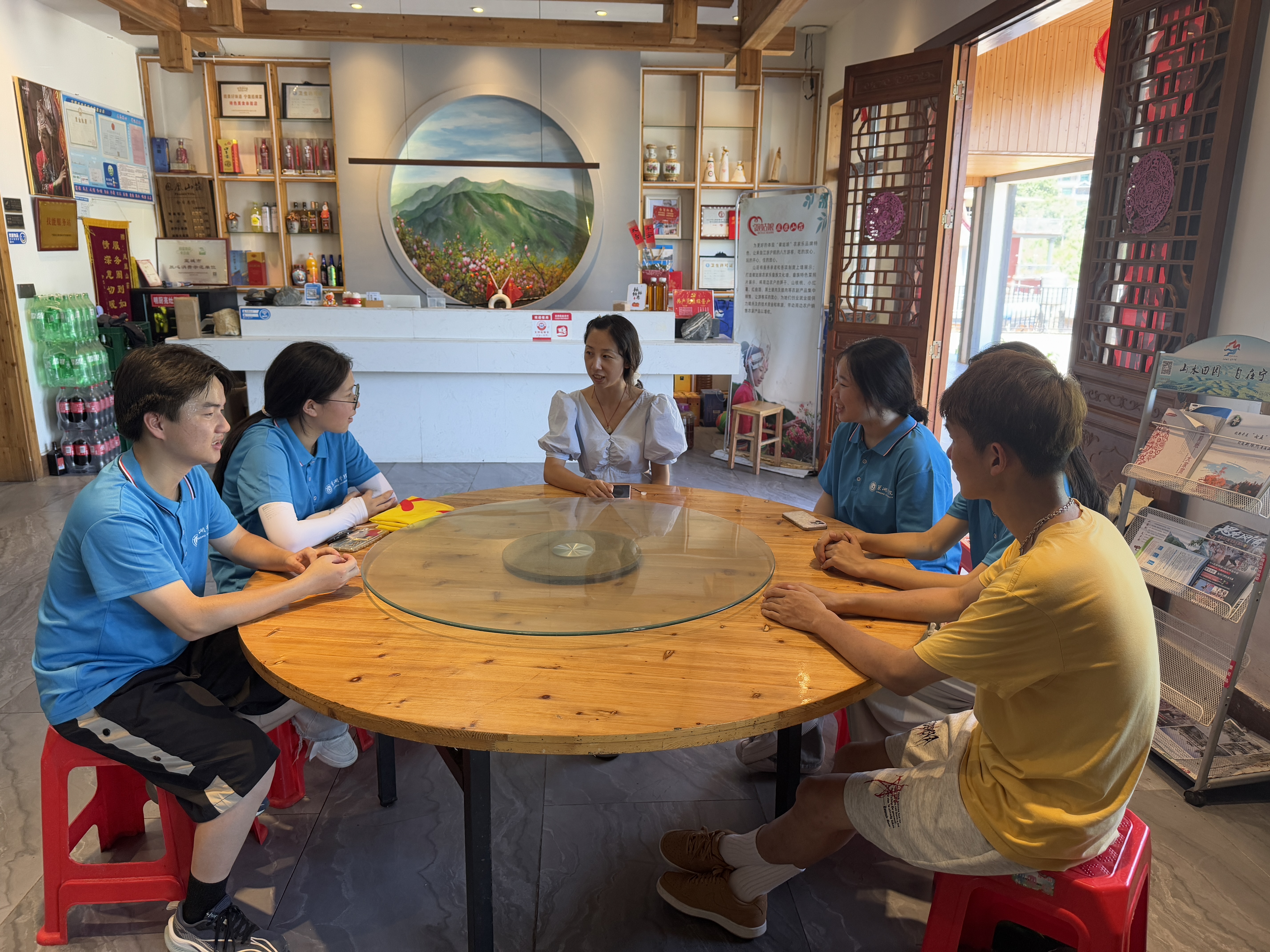 实践团还探访了当地的山核桃和笋干加工点,目睹从原料筛选、晾晒到加工包装的全过程,看着传统工艺与现代技术结合让农特产品走向更广阔的市场,深切体会到文化与产业融合的活力。实践团深知,文化保护不能只停留在体验层面,更要为畲乡的发展找到切实可行的路径。为此,他们兵分两路开展调研:一组聚焦文化传承现状,走访12位非遗传承人、30余户村民,记录下“年轻人外出务工导致技艺断层”“非遗产品缺乏市场渠道”等问题;另一组则深入了解当地产业情况,考察茶园、民宿、农产品合作社,梳理出“特色农产品销路窄”“文旅项目同质化”等发展瓶颈。此外,实践团还与当地文旅部门、乡村干部座谈,围绕“畲族文化与乡村振兴融合发展”展开探讨,记录整理了大量一手资料。